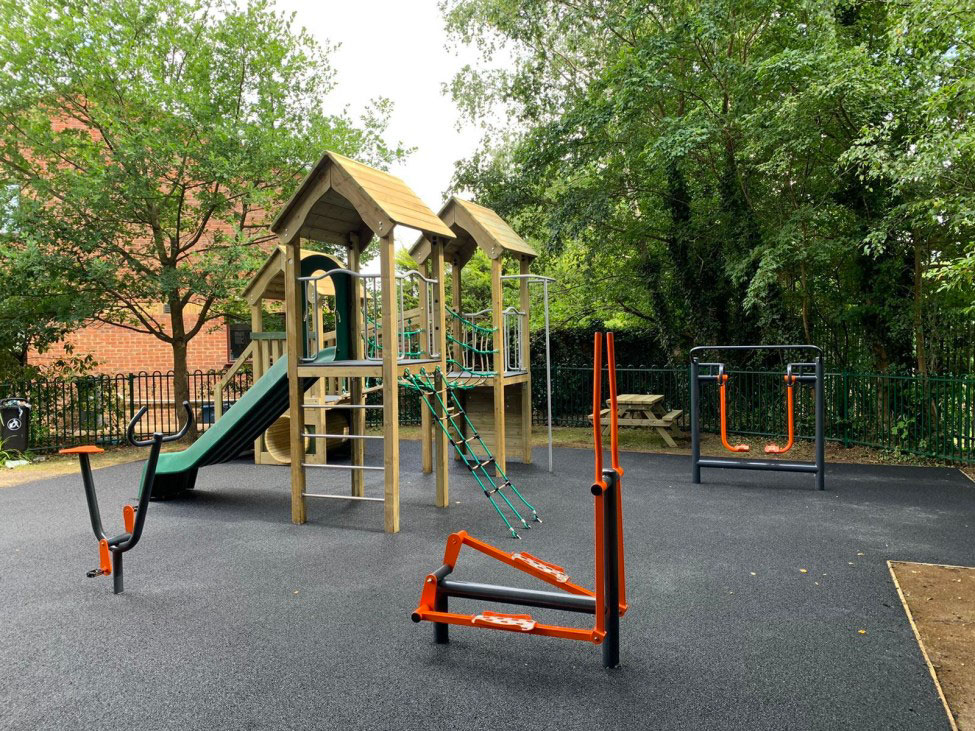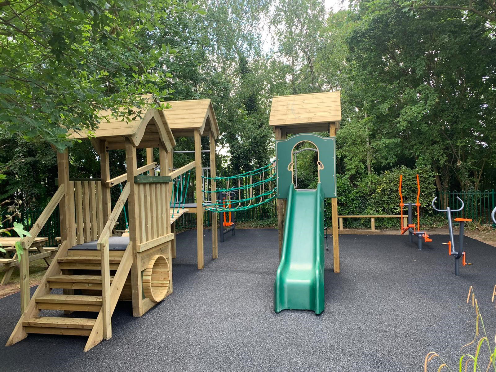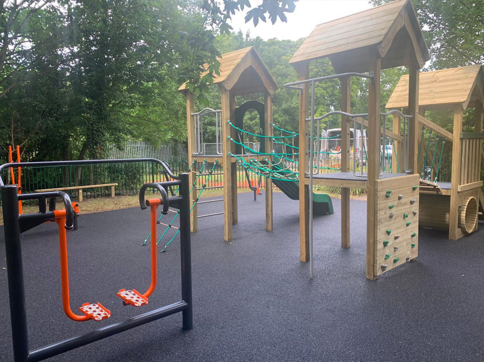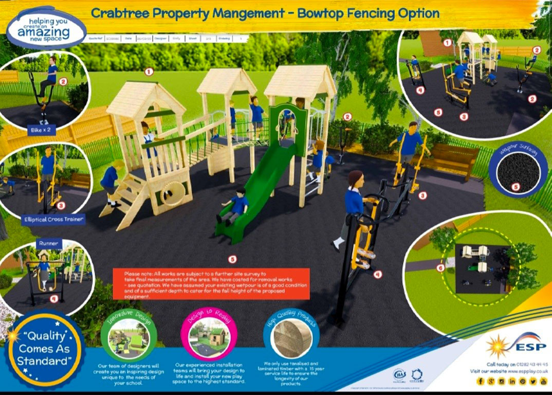 Following our meeting with Crabtree Developments, we wrote up out proposals for the site and our in-house design team design the space which was also compliant to the regulations. Our vision is to remove all the existing equipment and install with new, modern and attractive equipment. We decided that installing some adult outdoor gym enquipment into the area would be a great way to include adults and parents in the area. The multi-use timber play tower would be the central focal point with the gym equipment around the outer edge. The multi-use timber play tower is designed in a way that is very open ended play where chil-dren can use their imagination and creativity in play. It is also designed in a way that encourages communication and group play. The multi-use timber play tower also has interactive play panels where children can play games, and is open to a wide age range and abilities. We also designed picnic tables and bench seating into the area which would work well for holding community summer events. The play area would then be completely fenced in with stell bow-top fencing with self-closing gate suitable for wheelchair access.
