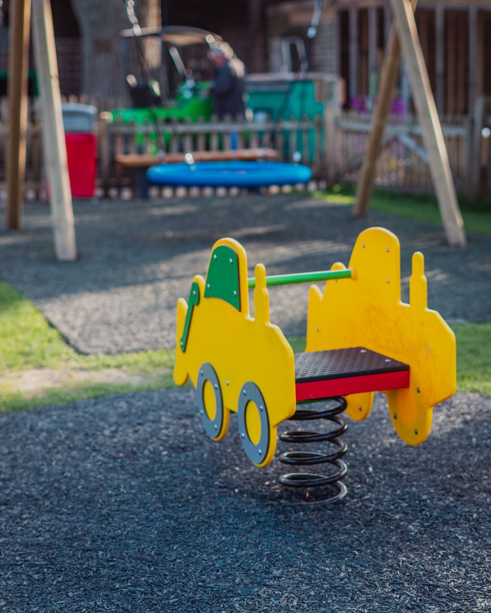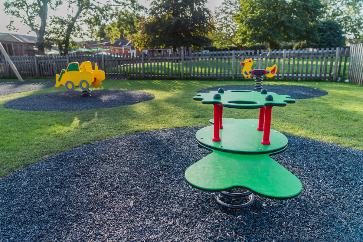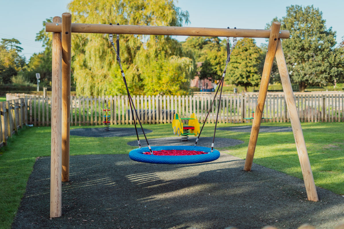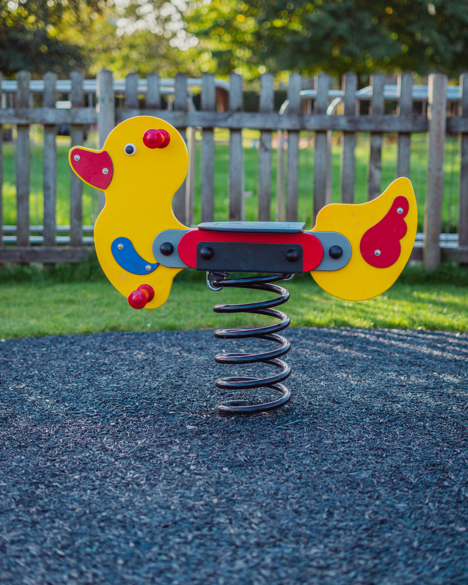 Following the discussions we have had with the team at Glebe Farm as well as talking to some of the local parents and children, our in-house design team started on the plans and designs for the new playground. The idea was to keep things simple, low maintenance and equipment with a long life span. We decided to keep the existing rural farm theme with a timber multi-play tower, including a slide and various elements which encouraged creative and open play. Springer Animals, related to the farm were also chosen with a double timber swing set and a basket swing for inclusive group play. The play surfacing around the equipment was Rubber Mulch with turf areas in between. This was done to allow the water to drain away from site easily and with adequate drainage facilities.