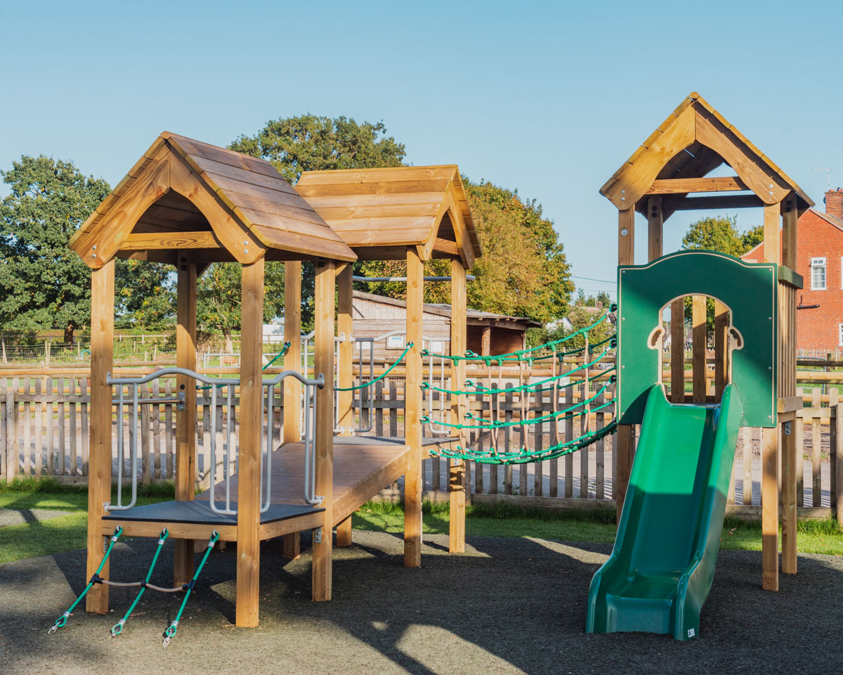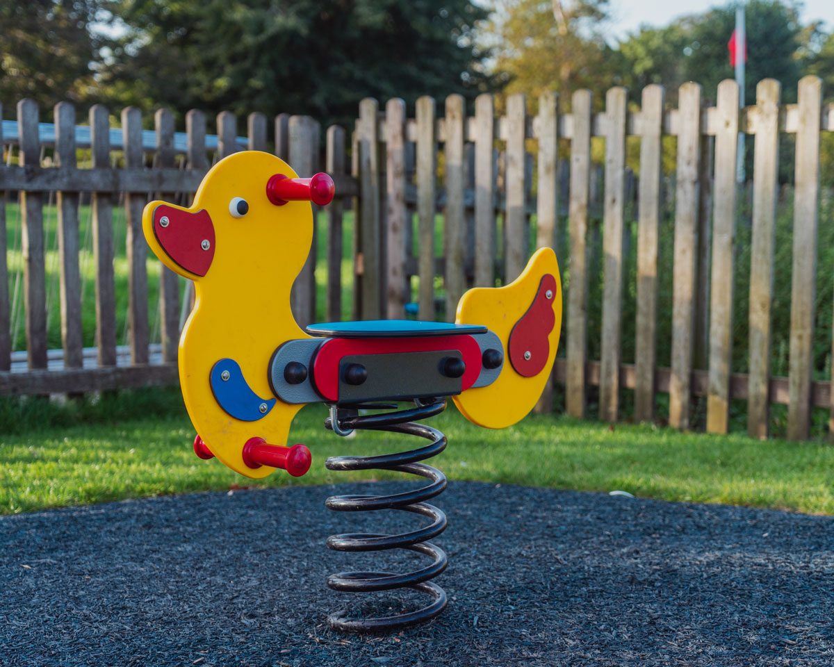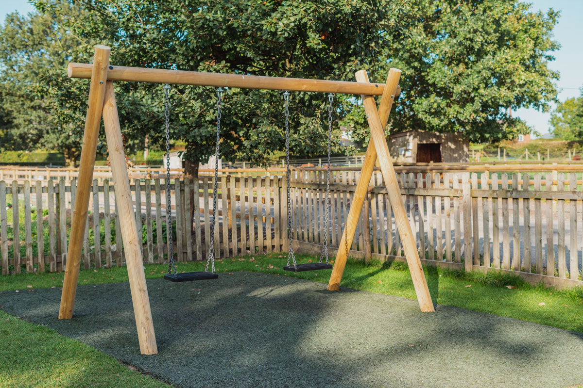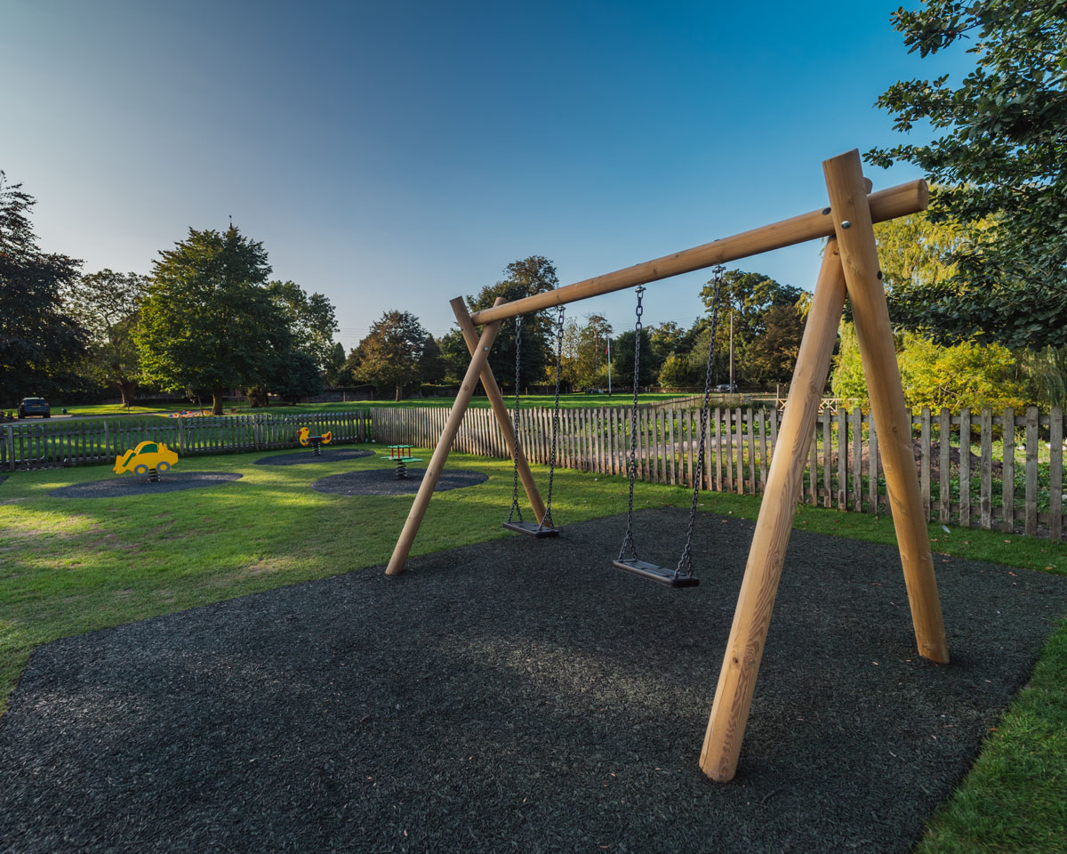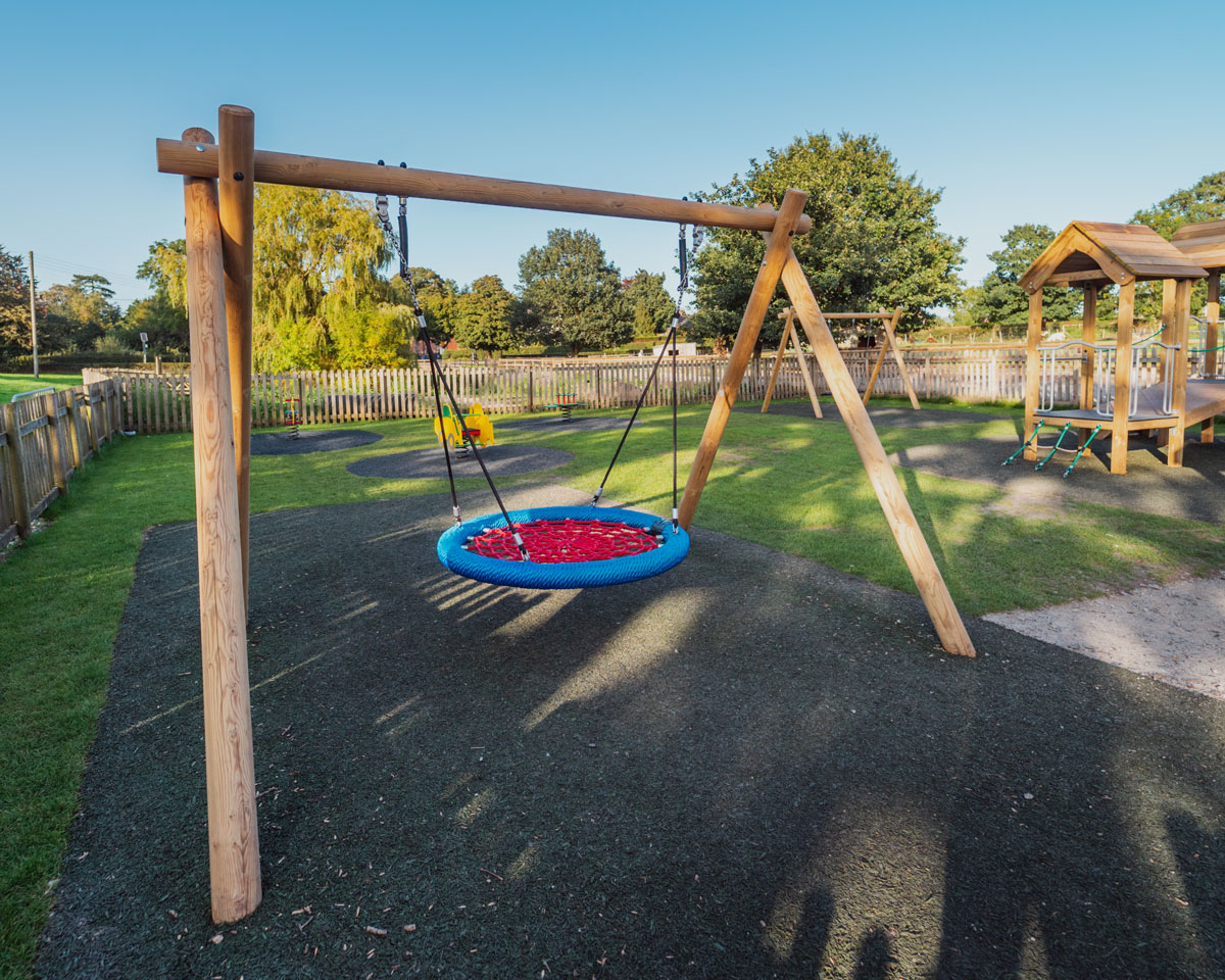 Following the discussions we have had with the team at Glebe Farm as well as talking to some of the local parents and children, our in-house design team started on the plans and designs for the new playground. The idea was to keep things simple, low maintenance and equipment with a long life span. We decided to keep the existing rural farm theme with a timber multi-play tower, including a slide and various elements which encouraged creative and open play. Springer Animals, related to the farm were also chosen with a double timber swing set and a basket swing for inclusive group play. The play surfacing around the equipment was Rubber Mulch with turf areas in between. This was done to allow the water to drain away from site easily and with adequate drainage facilities.