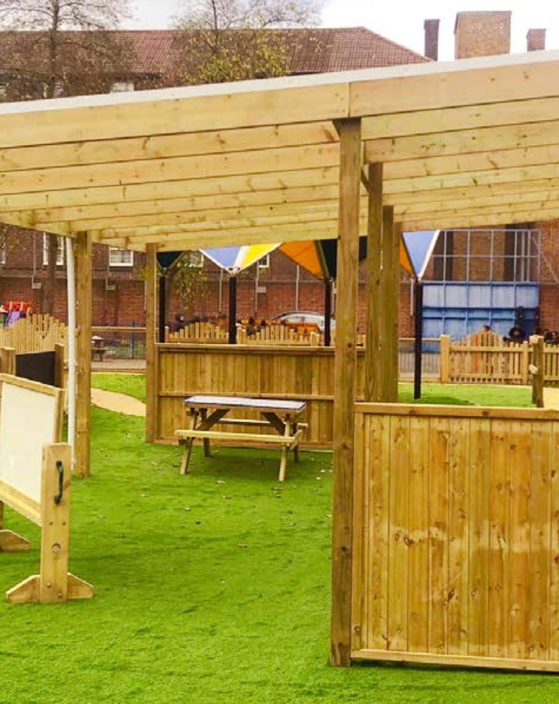 We can design, manufacture and install Lean to Canopies for schools throughout the whole of the UK . We can design a tailored made canopy to fit your school building and provide a continuous provision for learning but outdoors. To help make it as comfortable as possible, our team can also design bespoke sides to protect children from the wind and the rain. The sides could be chalkboards, whiteboards, water walls or fabric sides that you can roll up and down as and when required. We can also incorporate additional extras to make your canopy stend out such as coloured graphics to create a natural colour spectrum / rainbow feel.