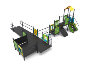 Large wheelchair accessible play frame with flowers play tower, activity panels, wobble bridge, climbing and wall.
