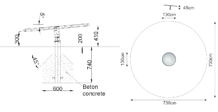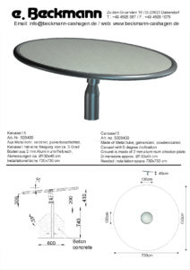 Disc inclined by 5°, to sit on, to lay on or to stand on. The floor is made from a 2 mm aluminium checker plate. Including ground anchor. High-quality bearings inside guarantee a long lifetime. Diameter 130 cm. Installation space 730 x 730 cm.