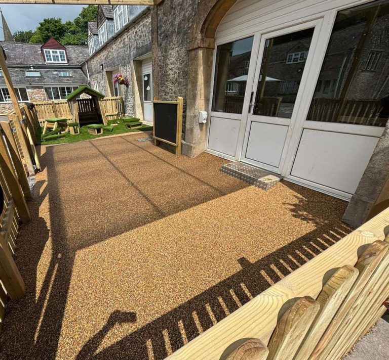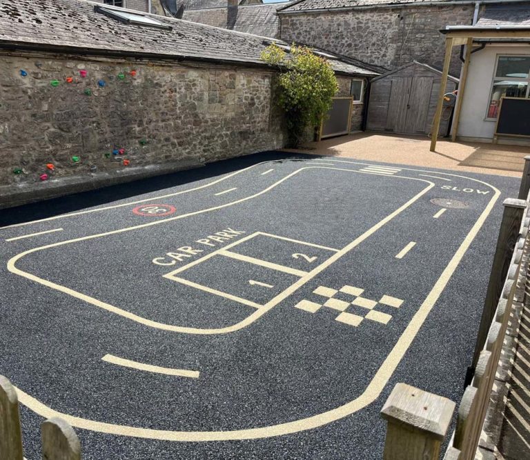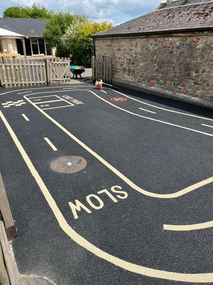 The rubber matting had to be replaced as this was causing trip hazard concerns. We replaced these with black wetpour, adding a roadway with parking bays and a mini climbing wall by utilising the existing brick wall.