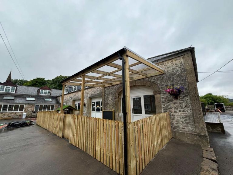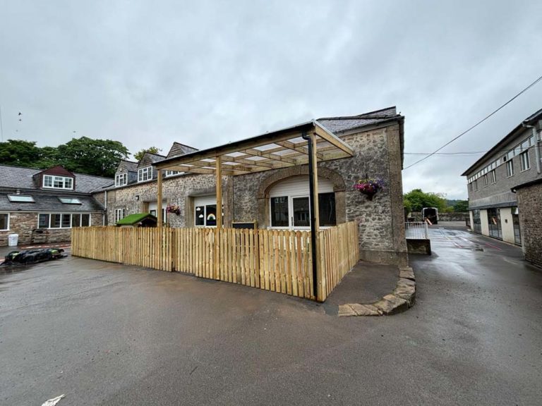 A small area that was surrounded with a mid-height fence. They wanted to replace the canopy that was located outside of the door as it had a gap which caused leaks during wet weather. Our lean to polycarbonate roof canopy provides a sheltered space that allows light in and has resolved the leak issue.
