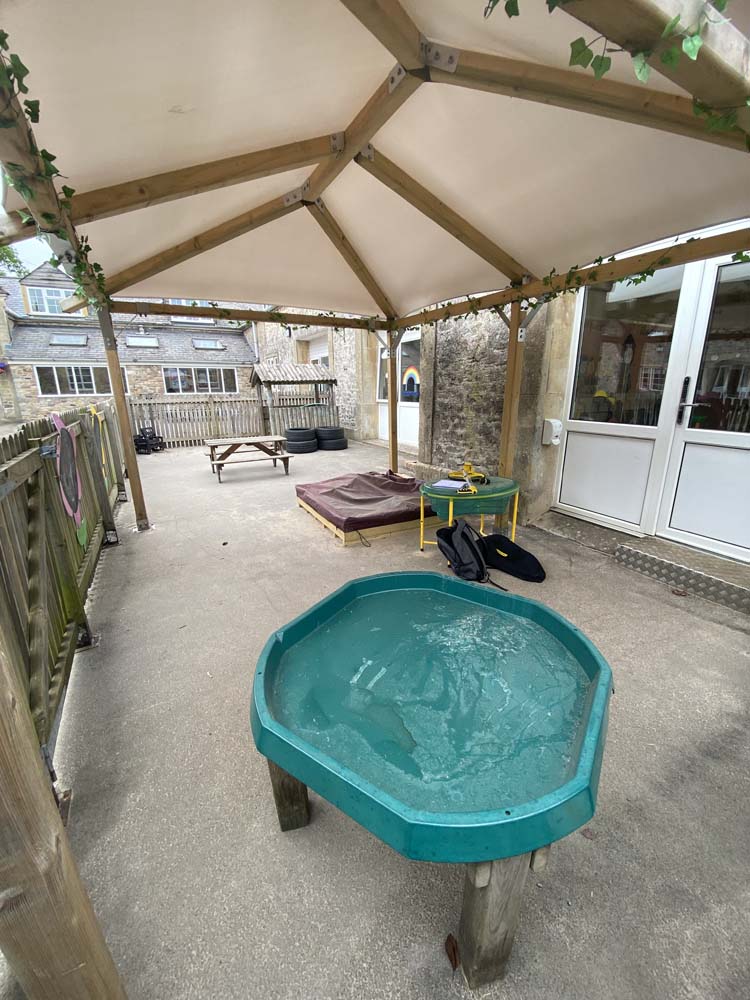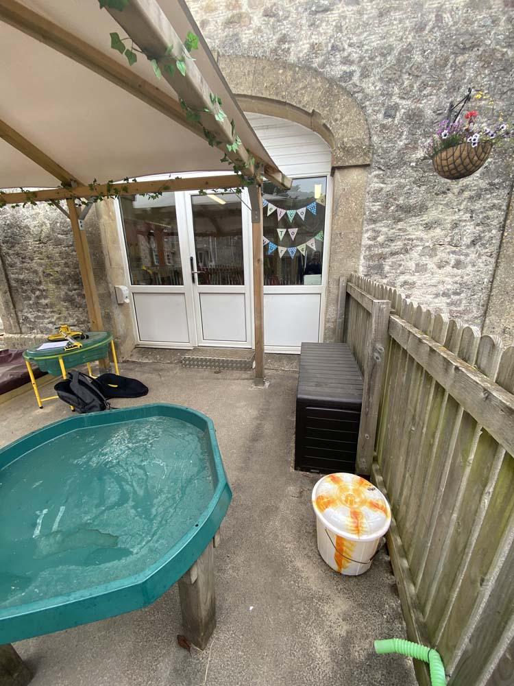 Artificial grass and resin bound gravel surfacing has been added to the rest of the area to brighten up the space and create a natural feel. Mark making boards, our magnetic water wall and square stage sandpit complete the area.