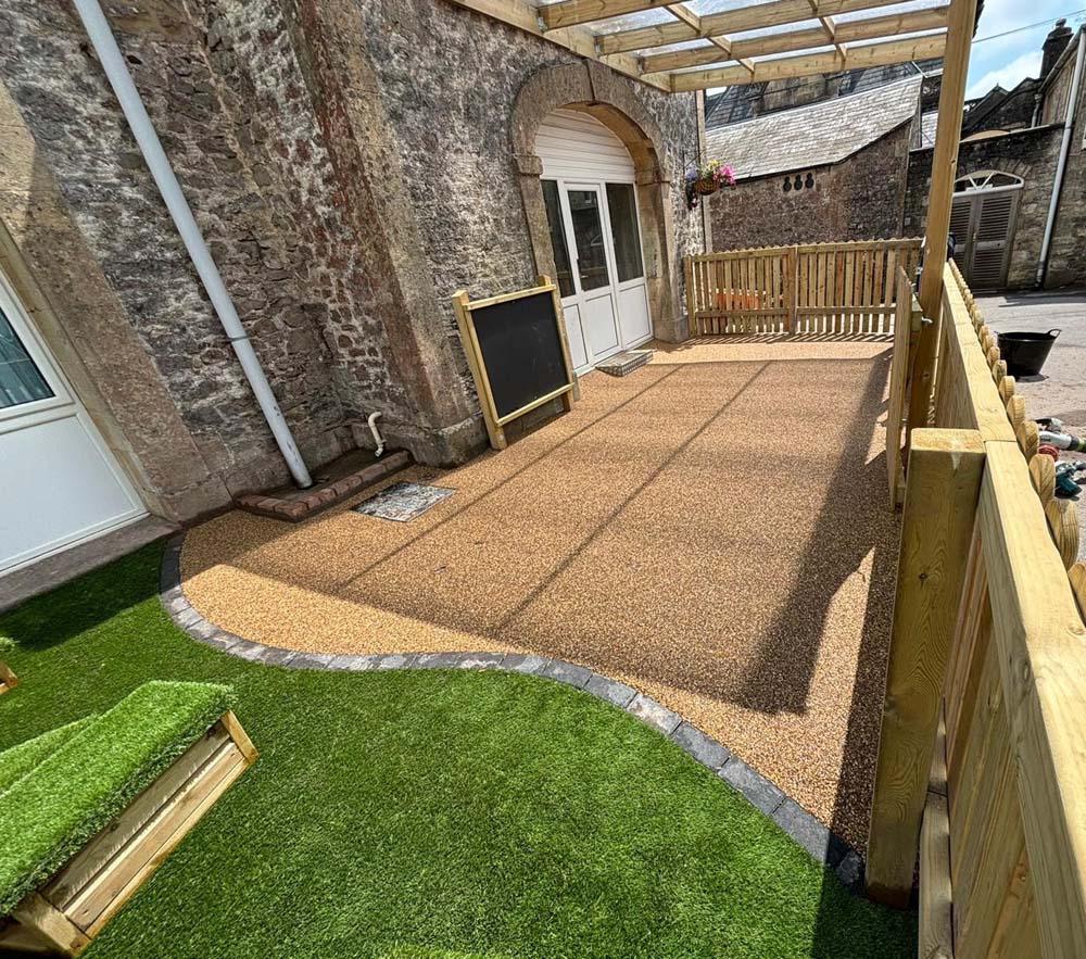 Artificial grass and resin bound gravel surfacing has been added to the rest of the area to brighten up the space and create a natural feel. Mark making boards, our magnetic water wall and square stage sandpit complete the area.