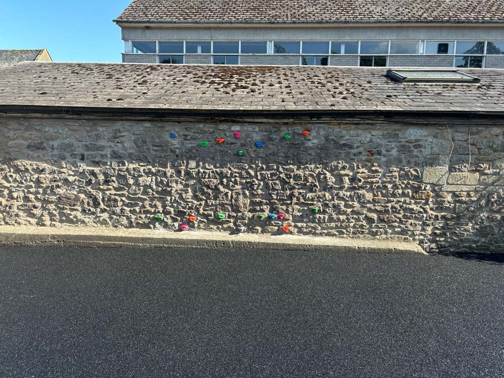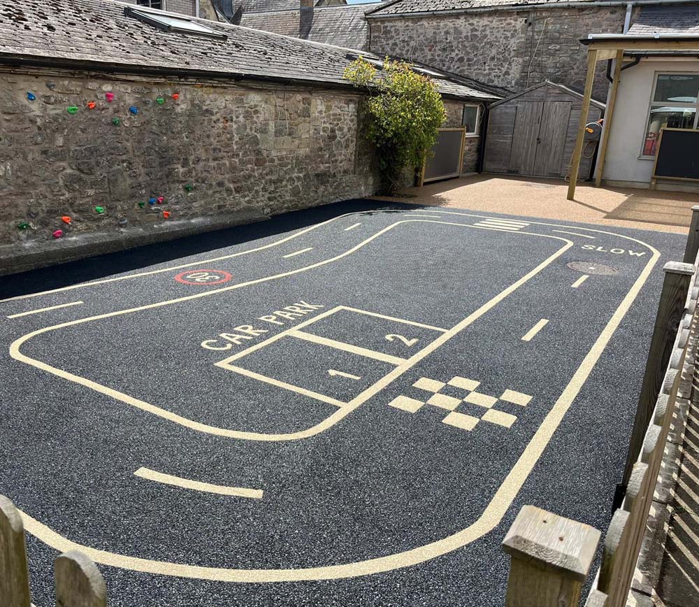 The rubber matting had to be replaced as this was causing trip hazard concerns. We replaced these with black wetpour, adding a roadway with parking bays and a mini climbing wall by utilising the existing brick wall.