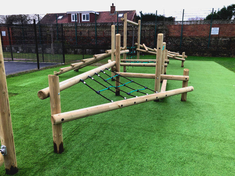 The ESP Play team installed two Tangled units; the Tarantula and Black Widow which were connected by a spinning log onto the grass area of the playground. The team laid an artificial grass surface under the climbing equipment allowing the space to be utilised all year round when it was previously only used during the summer months. This also meant that the tarmac area was kept free from any access obstructions and for the Multi-Skills markings to be laid.