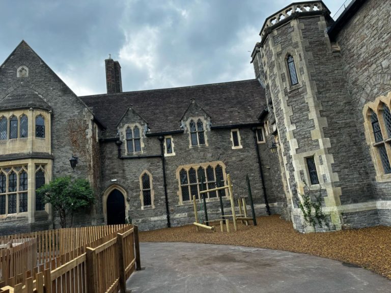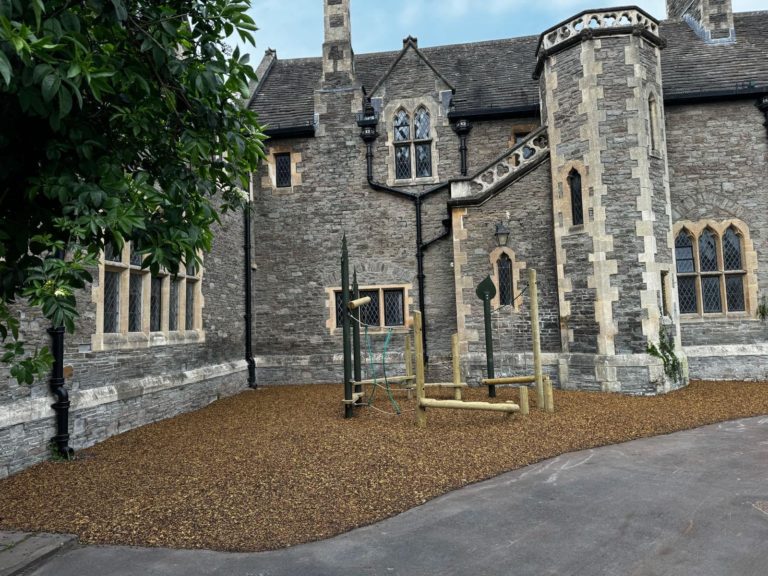 - Resin-bound mulch surfacing was installed to provide a durable, all-weather solution, ensuring the outdoor area remains accessible year-round in line with EYFS guidance that outdoor provision must be continuously available. A complementary tricolour mix was chosen to sit harmoniously within the school’s beautiful grounds, enhancing the natural setting while maintaining practicality.