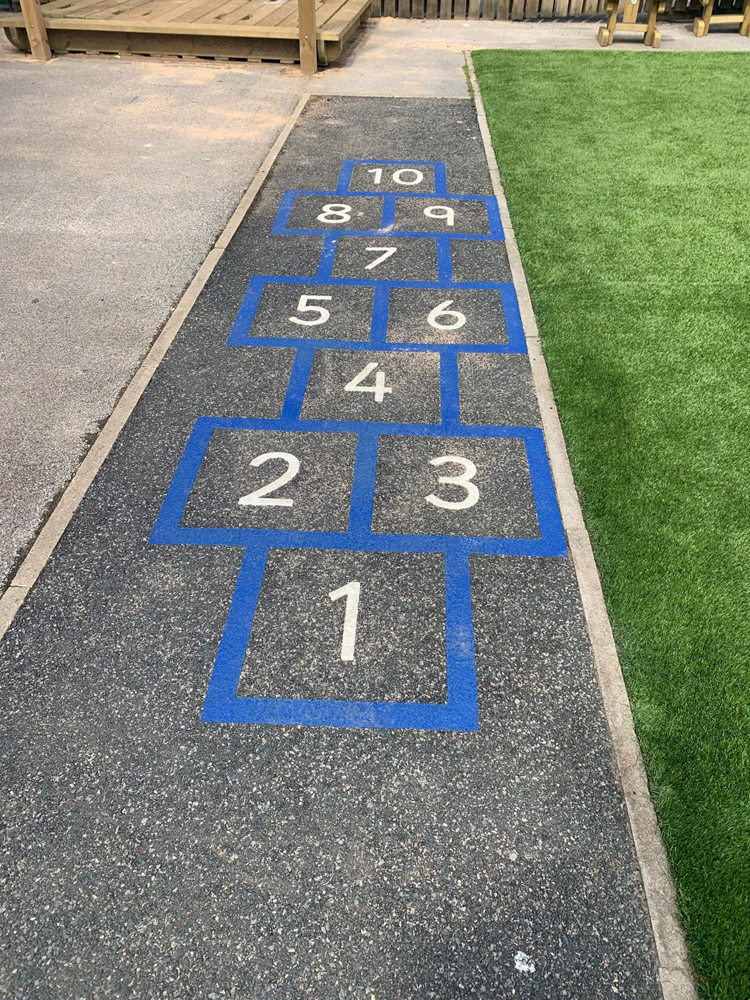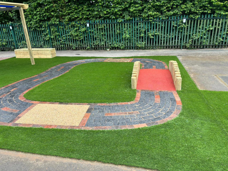 We then added pockets of artificial grass for a nice green natural looking environment to brighten the area up. The completed installation shows how a dull and worn playground can be transformed in to a bright natural learning environment that not only adds play value but now fits with the curriculum.