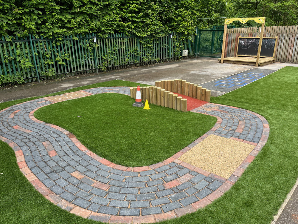 We then added pockets of artificial grass for a nice green natural looking environment to brighten the area up. The completed installation shows how a dull and worn playground can be transformed in to a bright natural learning environment that not only adds play value but now fits with the curriculum.