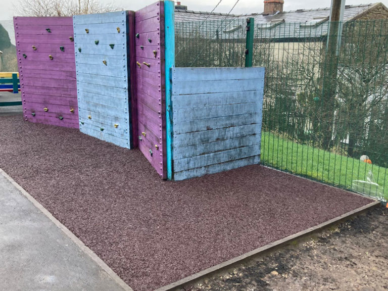 The area is now safe and compliant and the children can enjoy using the existing traverse wall again. Rubber mulch is an all-weather surface made using recycled rubber, not only is it a cost effective surfacing solution but it is also environmentally friendly because the material isn’t harvested in a damaging way. It has the natural look of bark without the rot or movement because the particles are bonded together with a special resin. It is a low maintenance, anti-slip, permeable surface that dry’s quickly and is available in several colour options.