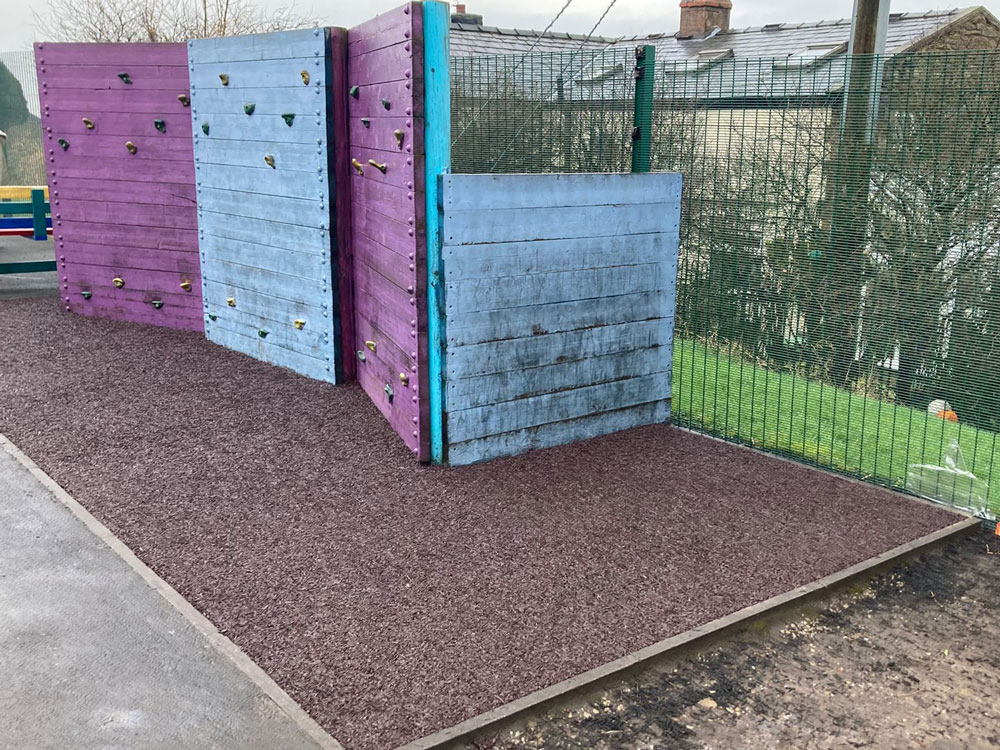 The existing rubber mulch surface was very worn, some of the rubber was shedding and the weed membrane was visible in areas. The surface had become a health and safety issue because the exposed membrane could cause the children to trip. The existing traverse wall was still in a good condition and so the school wanted it to remain.