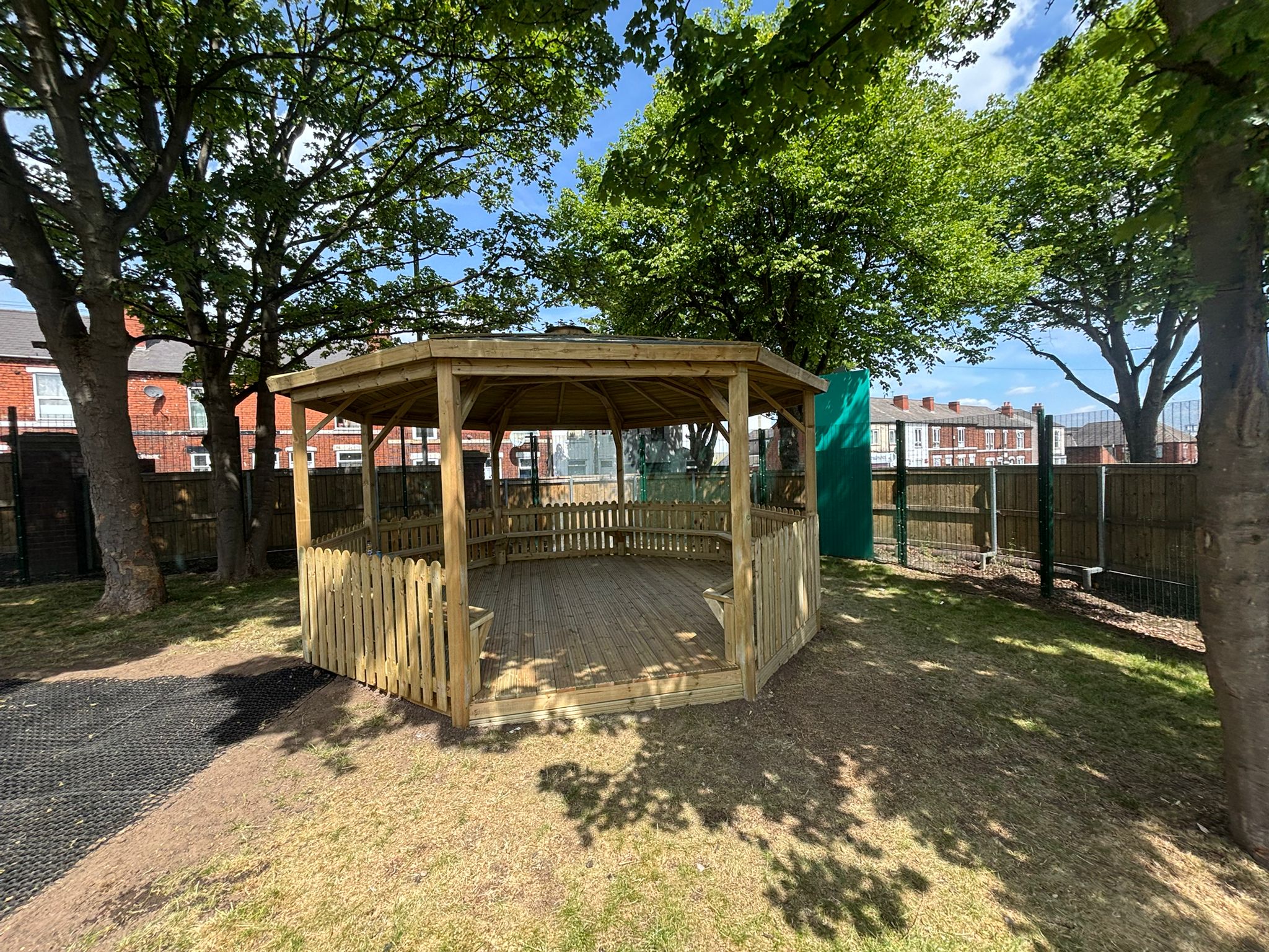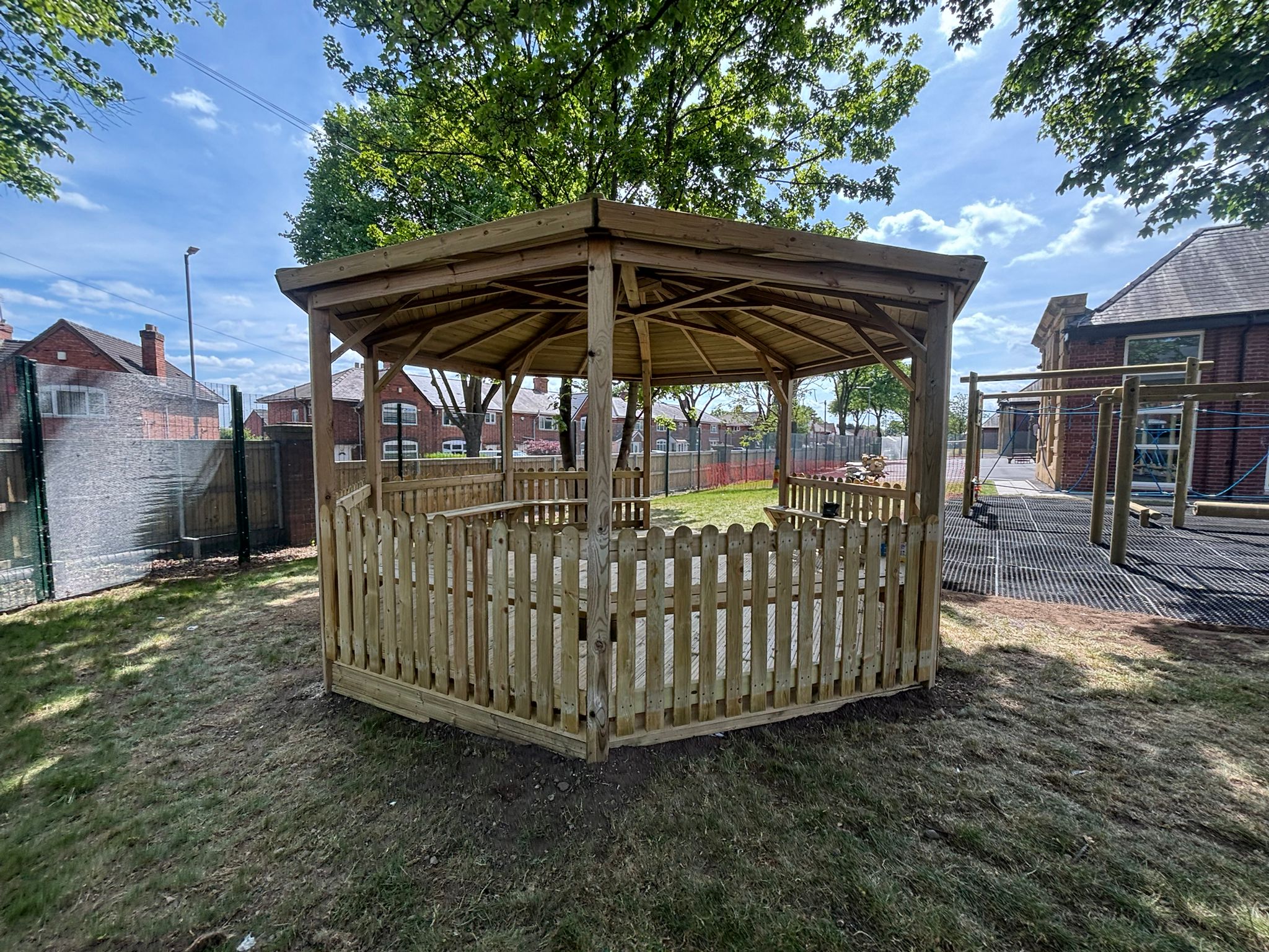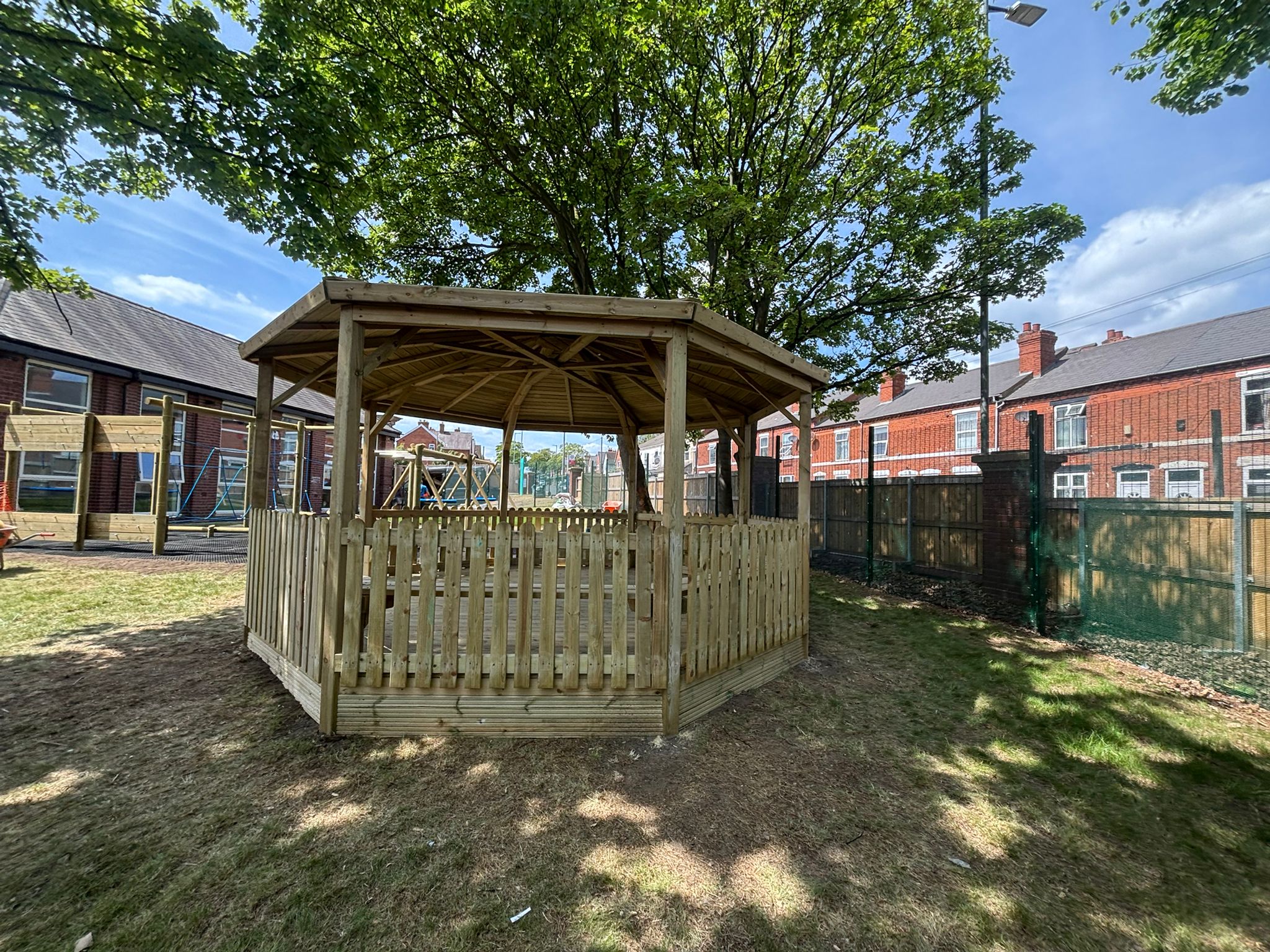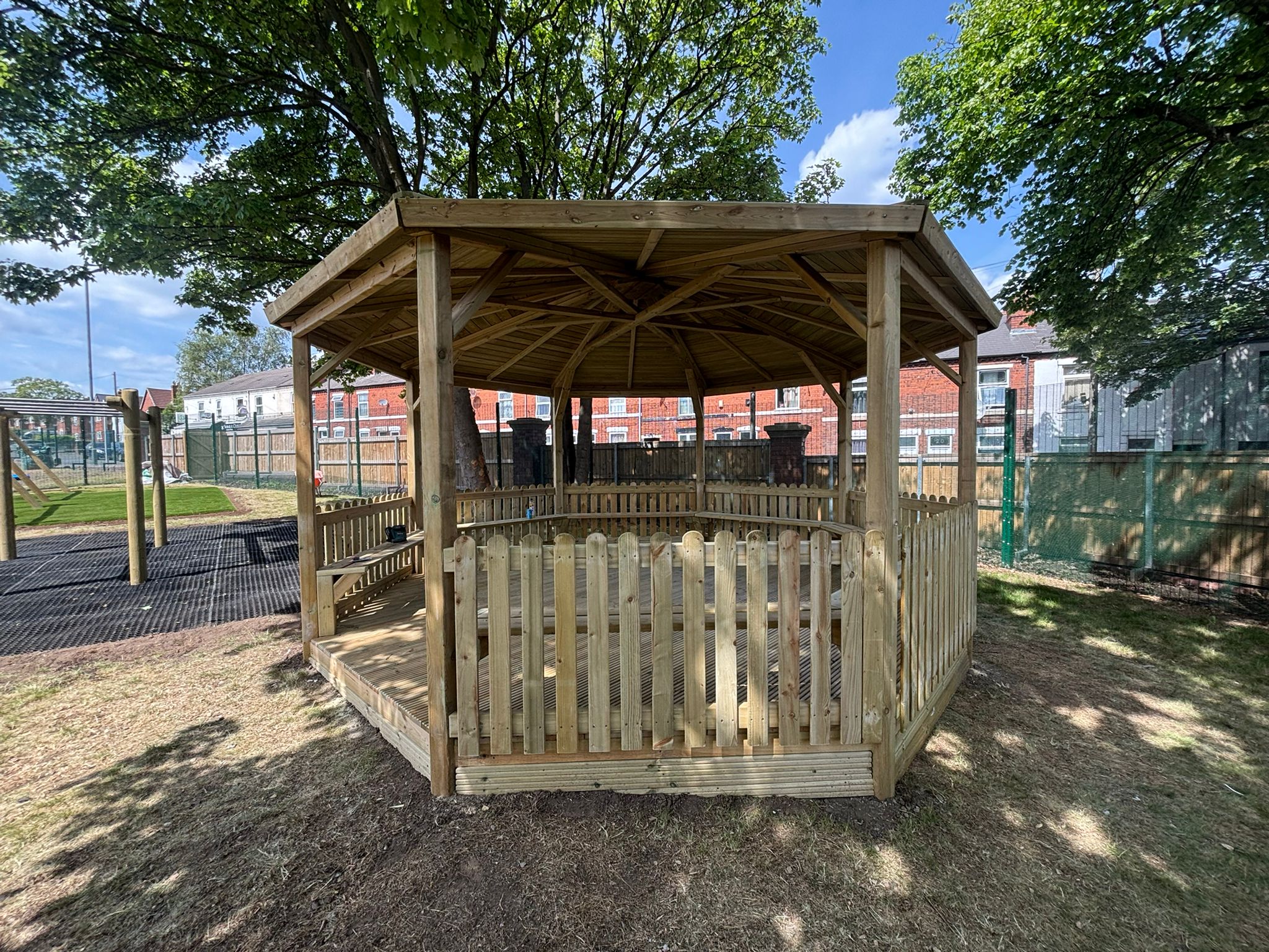 - Octagonal shelters providing covered, year-round access to the playgrounds in all weather conditions.