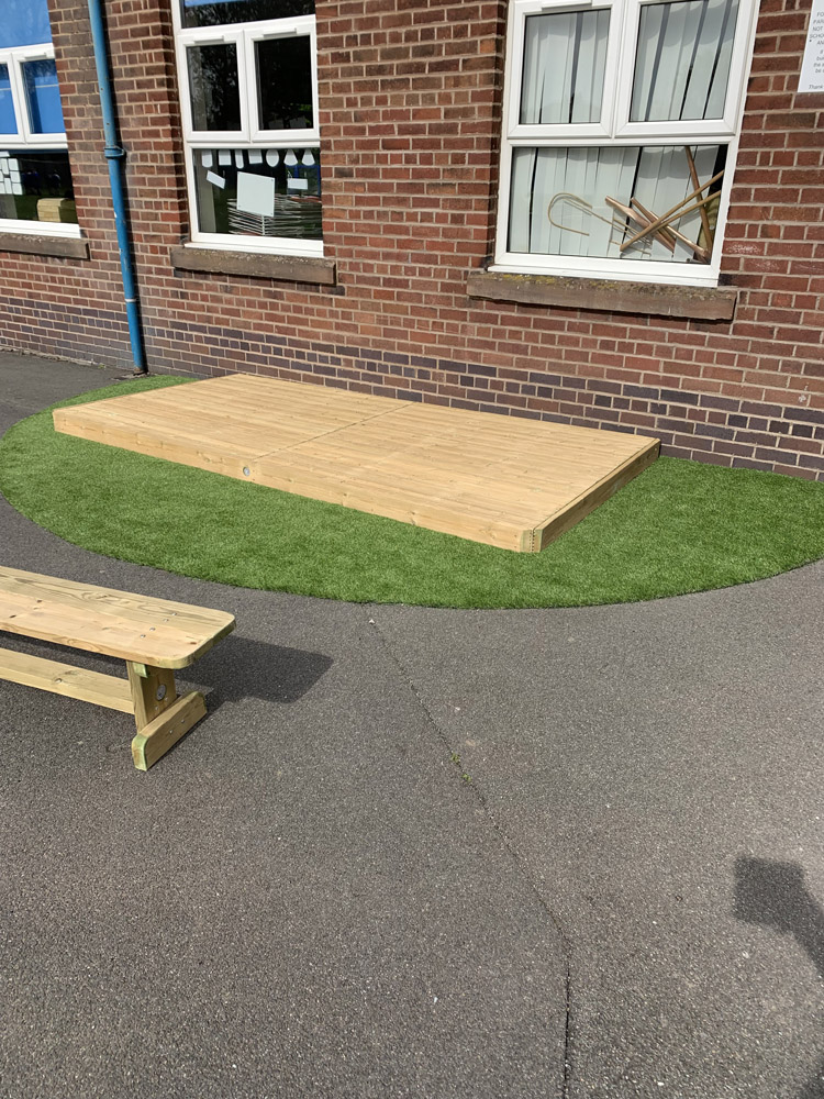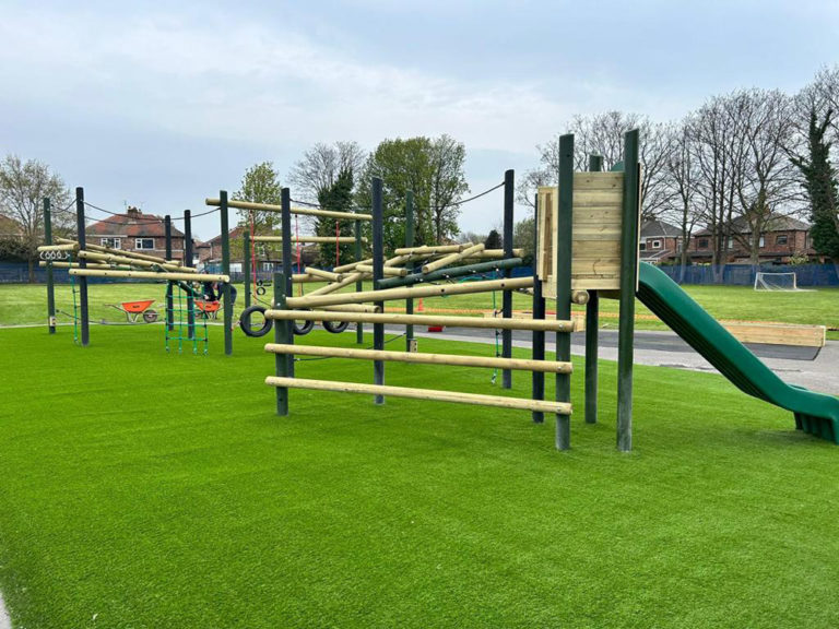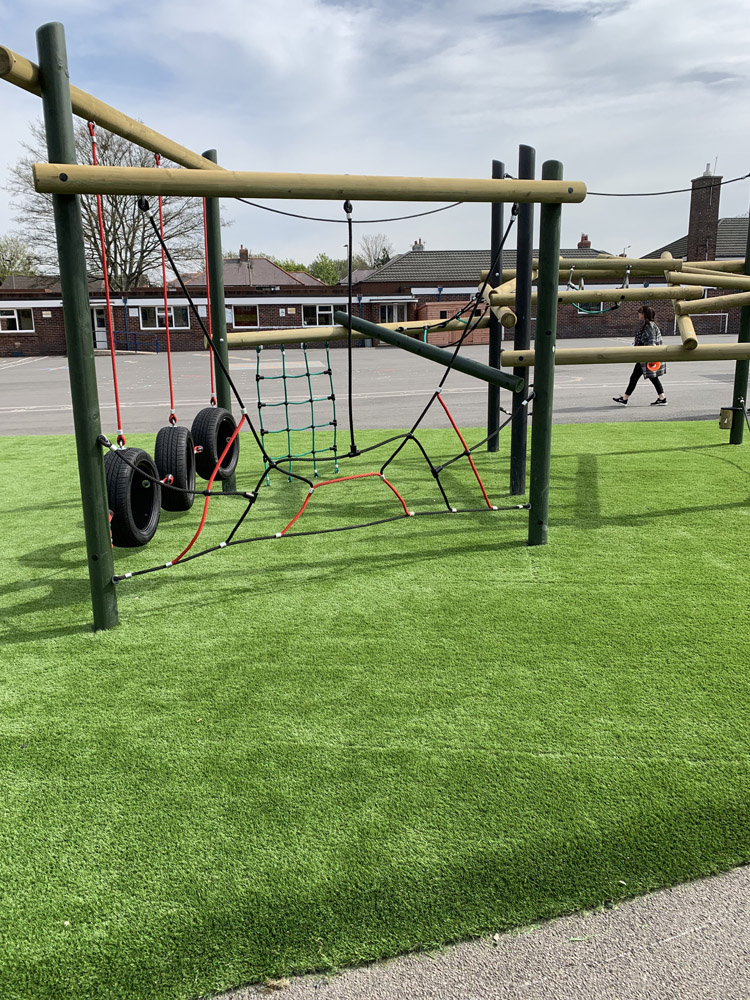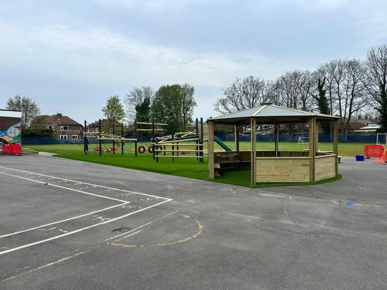Helping the school with the design to ensure we met the needs of the children as well as the budget we created a chill out area with picnic tables, planters and benches for those looking for some quiet time. A physical activity area to get the children active where we included our Tangled Huntsman with Slide and Tangled Huntsman with Tyre Pass to accommodate as many children as possible. The school also have a performance area for the little ones to test out their acting skills and an octagonal shelter that can be used for outdoor learning and a place to shelter from the weather. We also included our high-grade artificial grass to brighten up the space and add a natural, landscaped theme.