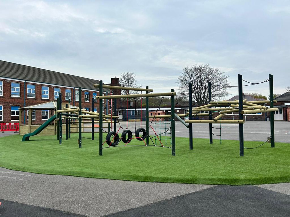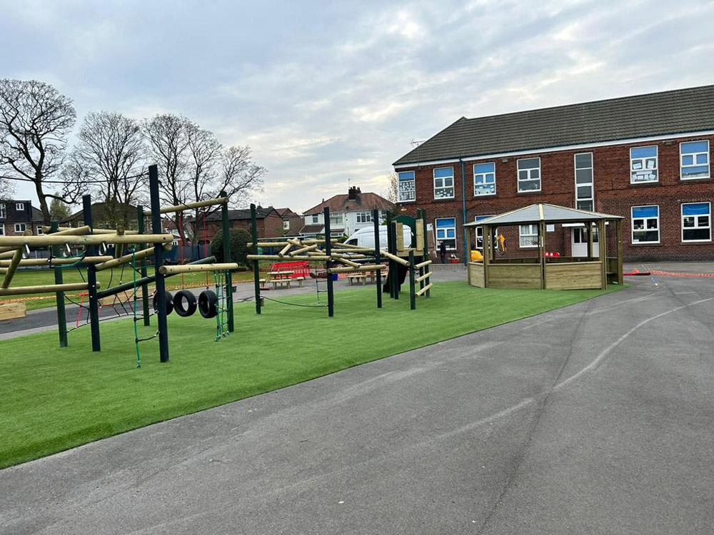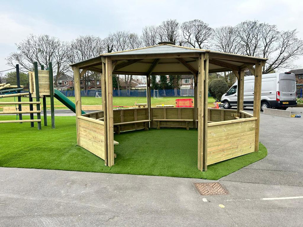 Helping the school with the design to ensure we met the needs of the children as well as the budget we created a chill out area with picnic tables, planters and benches for those looking for some quiet time. A physical activity area to get the children active where we included our Tangled Huntsman with Slide and Tangled Huntsman with Tyre Pass to accommodate as many children as possible. The school also have a performance area for the little ones to test out their acting skills and an octagonal shelter that can be used for outdoor learning and a place to shelter from the weather. We also included our high-grade artificial grass to brighten up the space and add a natural, landscaped theme.
