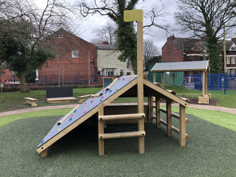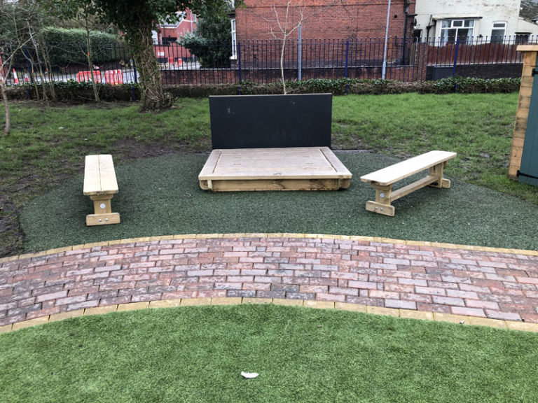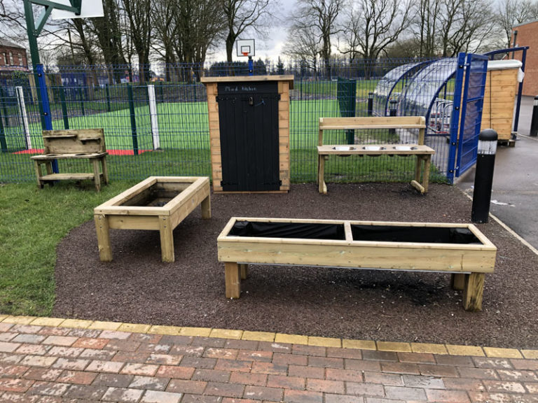 The project started with a meeting at the new school site to discuss the school’s requirement’s and to carry out a survey of the area. ESP Play then created a design combining the schools wish list and ensuring it was within the 27k budget. The design included various types of surfacing in order to create different textures, a sandpit which doubled up as a stage with a chalk board back drop and freestanding benches, a small shelter with seating and planters, a wheelchair accessible mud kitchen, messy table, mud trough, storage and a climbing hut which combines imaginative play along with aiding the development of gross motor skills.