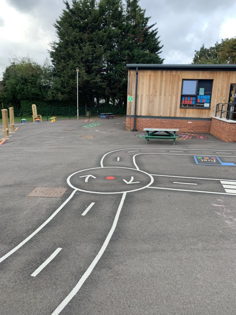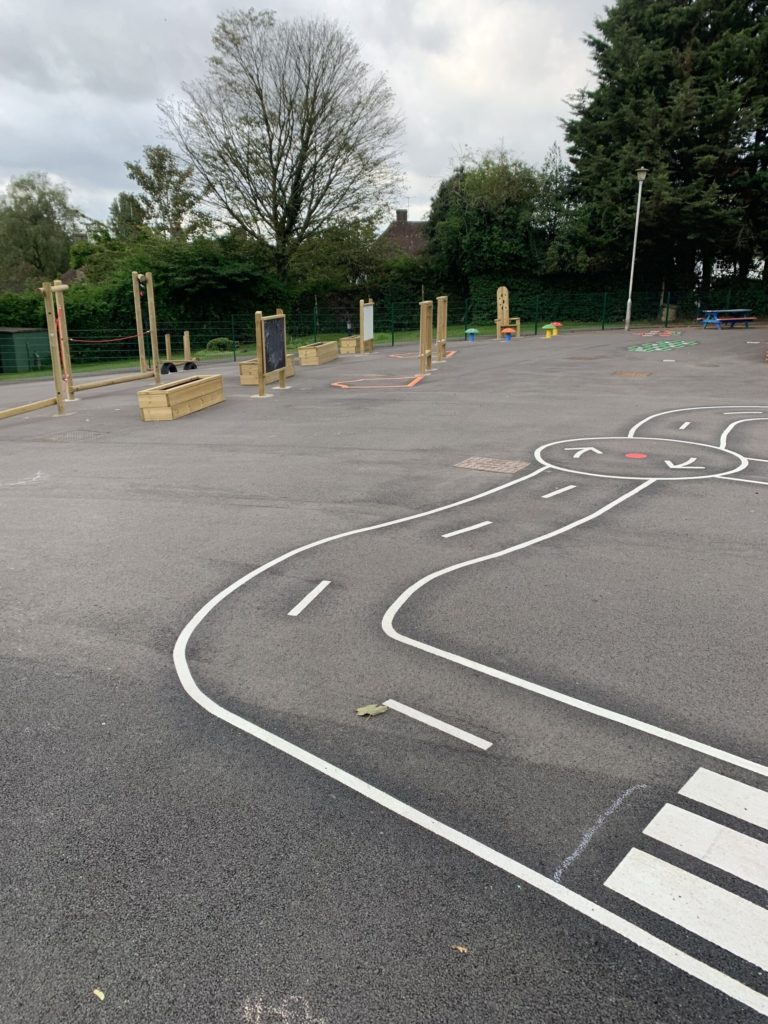 After the free consultation, we got to work on the free playground design. Considering the slope of the area, we included a trim trail, playground markings for games and a roadway for physical activities. A storytelling chair with vibrant mushroom seats forms an enchanting storytime corner. At the slope’s base, we installed a stage with music panels and seating for young performers. A raised play hut offers a tranquil retreat for children seeking calm. Creative learners have mark-making panels at the slope’s summit. To conclude, planters were arranged along the slope’s edge to serve as a natural barrier.