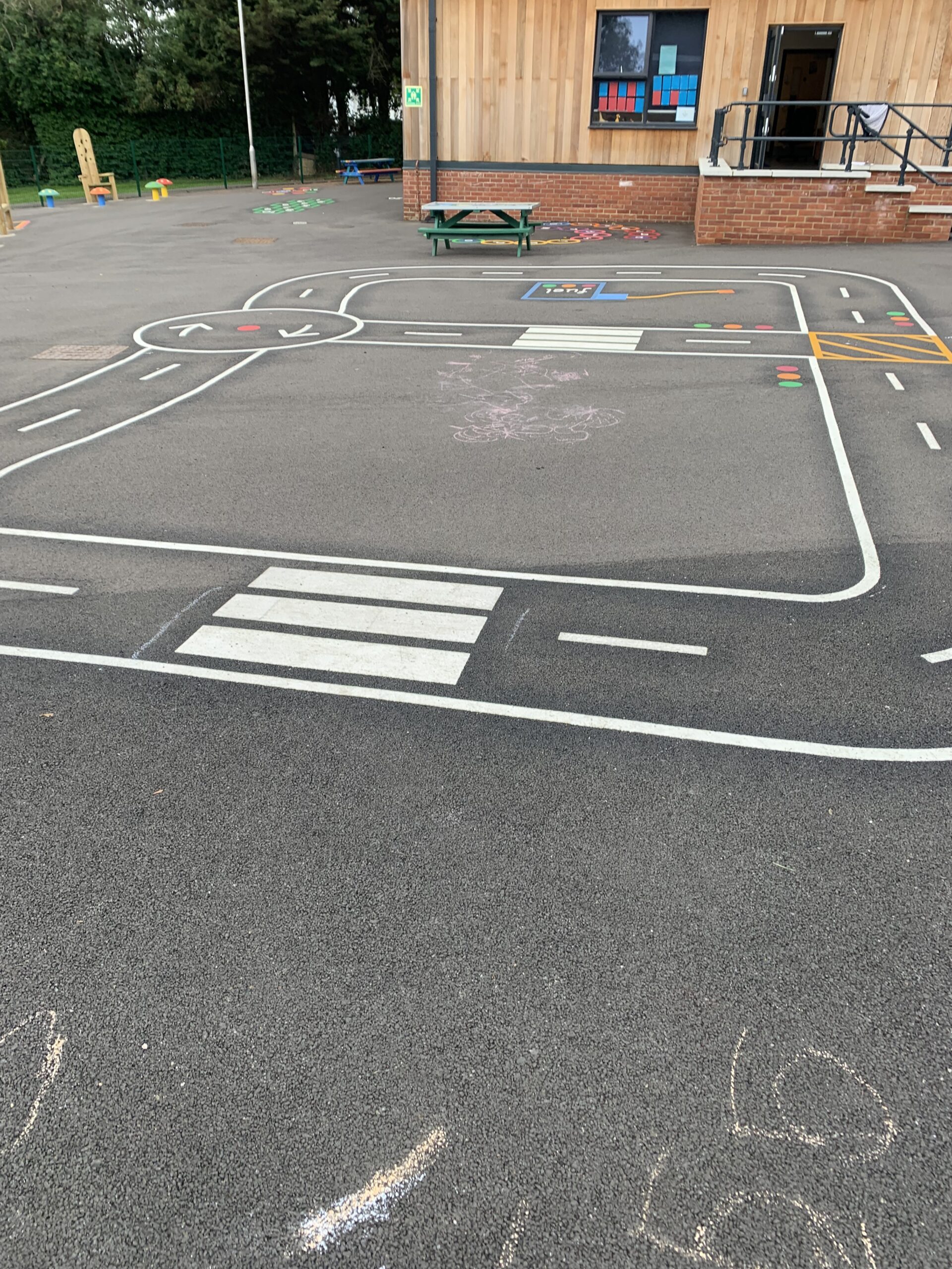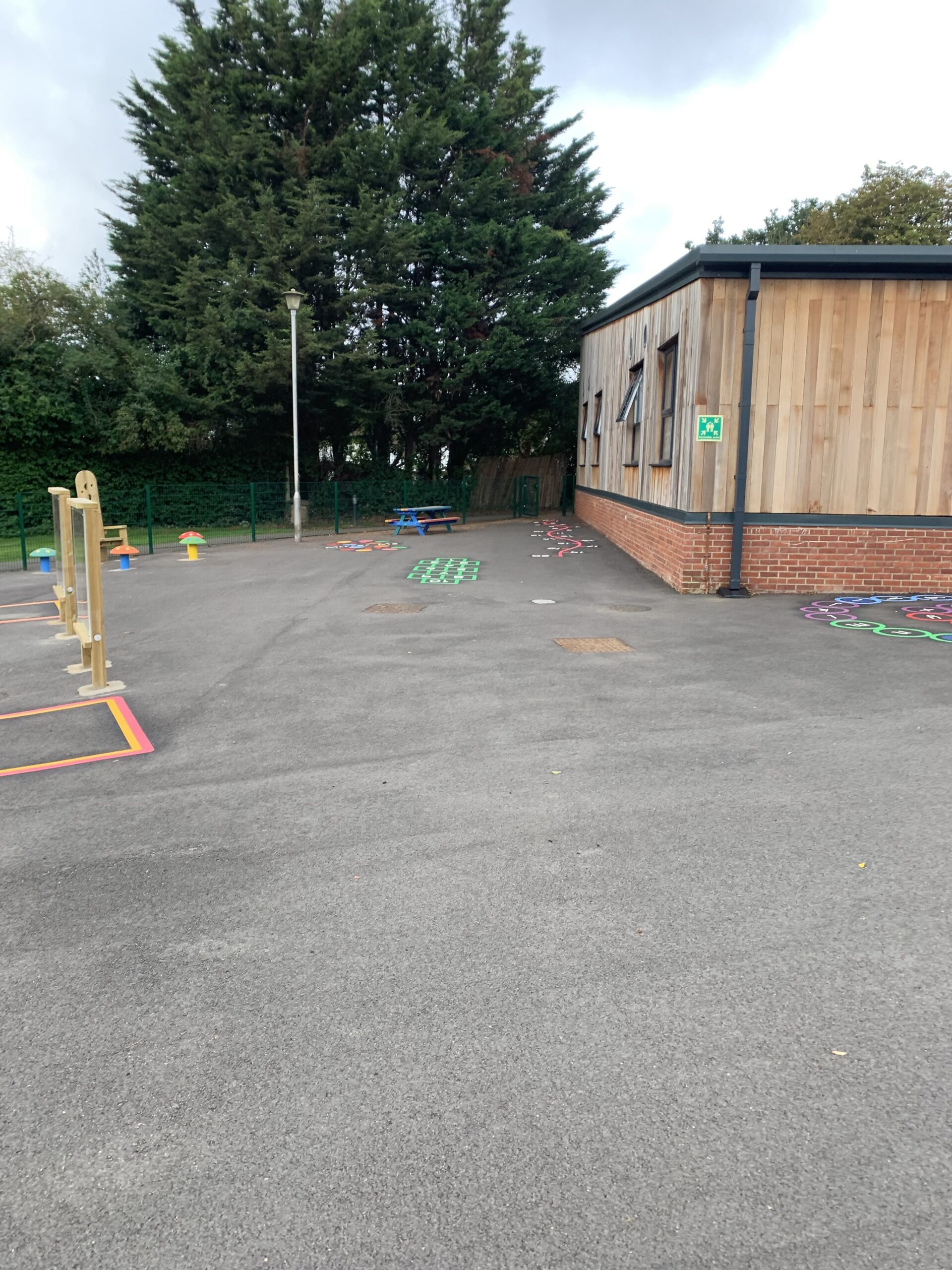 After the free consultation, we got to work on the free playground design. Considering the slope of the area, we included a trim trail, playground markings for games and a roadway for physical activities. A storytelling chair with vibrant mushroom seats forms an enchanting storytime corner. At the slope’s base, we installed a stage with music panels and seating for young performers. A raised play hut offers a tranquil retreat for children seeking calm. Creative learners have mark-making panels at the slope’s summit. To conclude, planters were arranged along the slope’s edge to serve as a natural barrier.