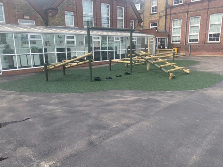 Across KS1&2, ESP designed a purpose built multi-use games area (MUGA) to create a dedicated and contained space for PE and sport to be played at all times of the day. A range of equipment was installed across the rest of the playground providing opportunities for climbing, quiet and performance play.