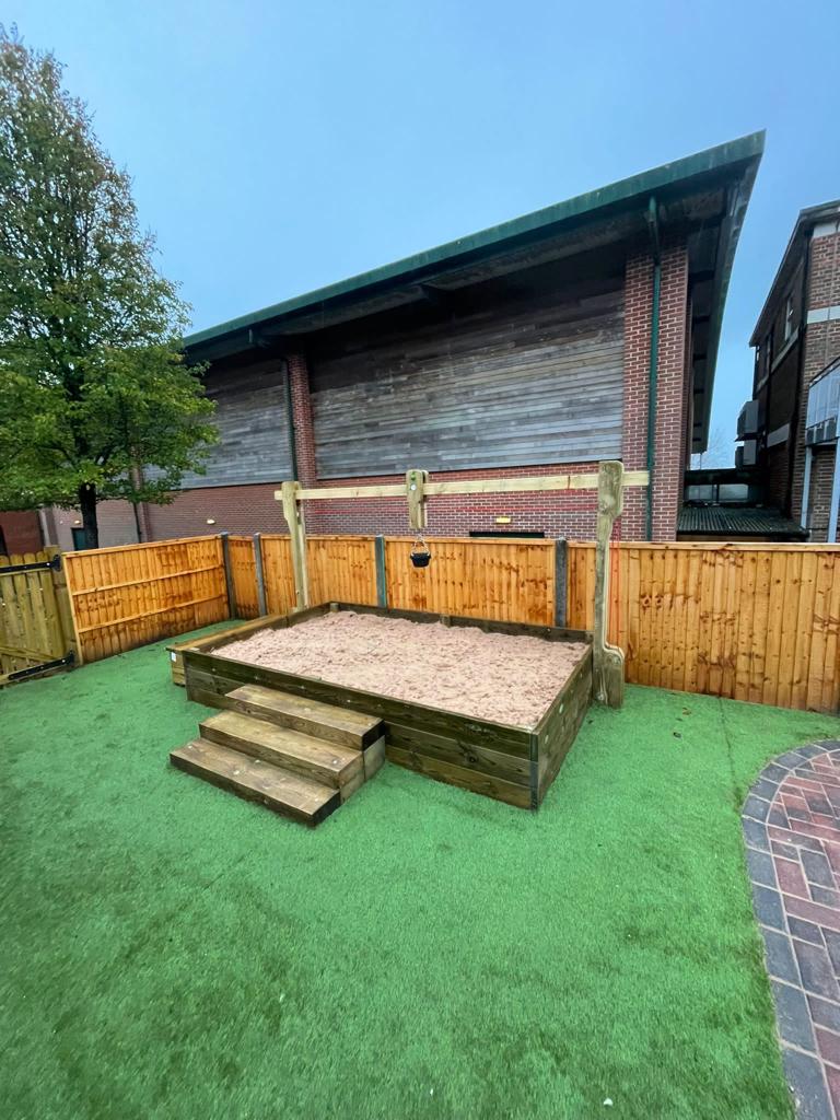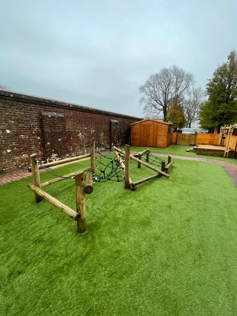 ESP levelled the surface eliminating the trip hazards. The playground was transformed with a natural theme using a mix of artificial grass and rubber mulch surfacing incorporating a sensory roadway in the middle of the space. We added one of our Tangle Wood structures to the centre of the roadway creating a physical activity area. A sand zone with a pully system and mud zone with kitchens and tables were positioned at each end of the area to help with imaginative play and to increase fine and gross motor skills. A shelter, seating, tables, chalkboard and storage cupboards were included to provide an outdoor learning zone.