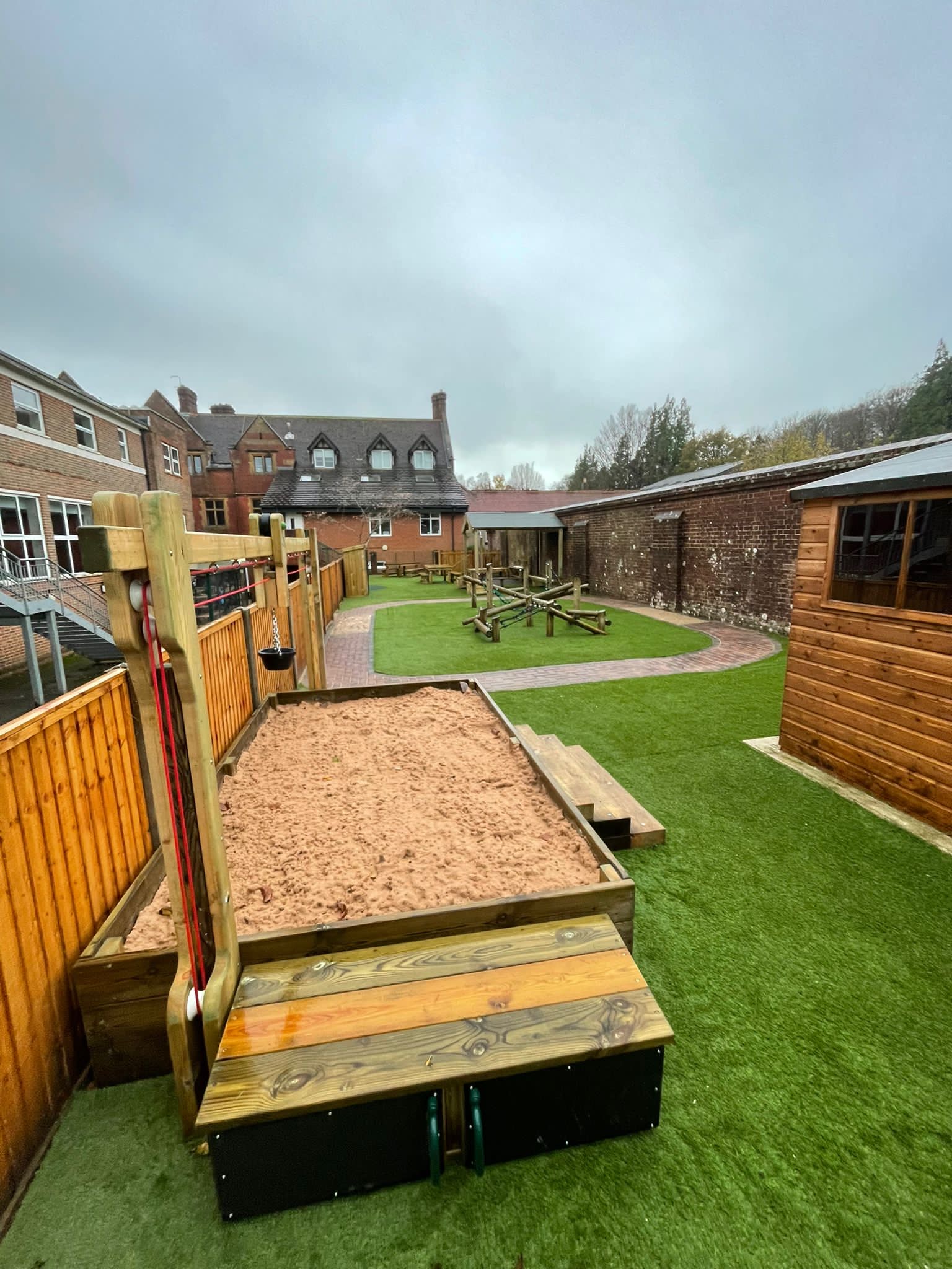ESP levelled the surface eliminating the trip hazards. The playground was transformed with a natural theme using a mix of artificial grass and rubber mulch surfacing incorporating a sensory roadway in the middle of the space. We added one of our Tangle Wood structures to the centre of the roadway creating a physical activity area. A sand zone with a pully system and mud zone with kitchens and tables were positioned at each end of the area to help with imaginative play and to increase fine and gross motor skills. A shelter, seating, tables, chalkboard and storage cupboards were included to provide an outdoor learning zone.