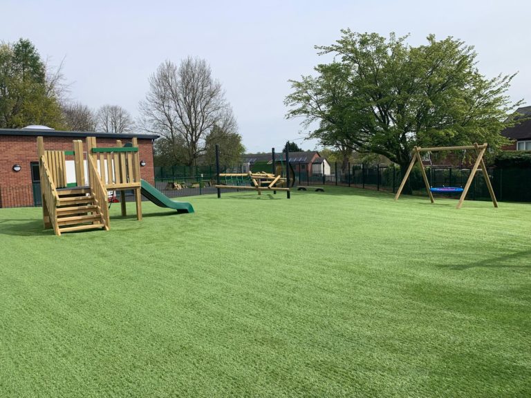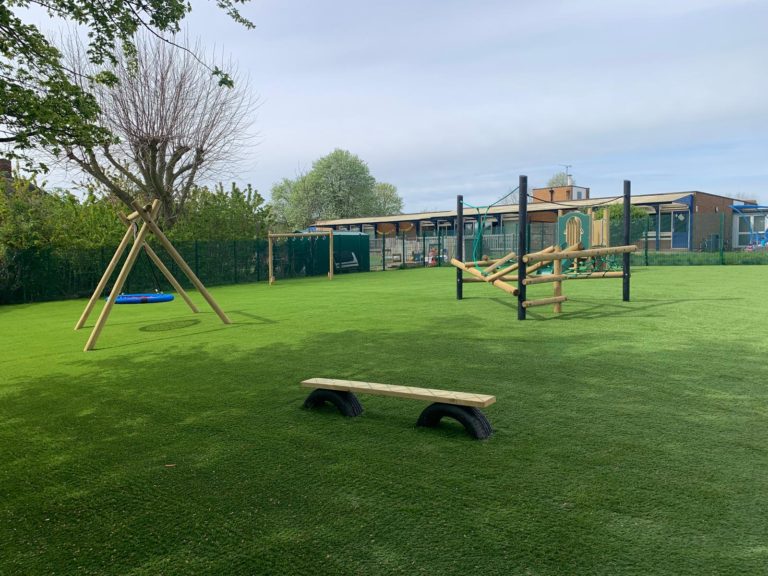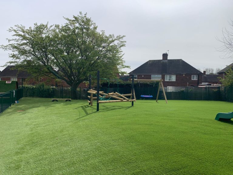 Outcome – The success of this project was all in the preparation. The 500m2 grassy area underwent complete excavation, including the removal of waste, and regrading with spoil from the site itself. A 100mm layer of MOT type stone was installed to enhance drainage and ensure level consolidation. These groundworks were topped with high grade 35mm pile artificial turf. The SEN play area, featuring swings, rotators, climbers, and spinners, meets the client’s specifications and compliments the space. The design of the SEN play zone is future-proof, allowing for adaptation to the evolving needs of the school.