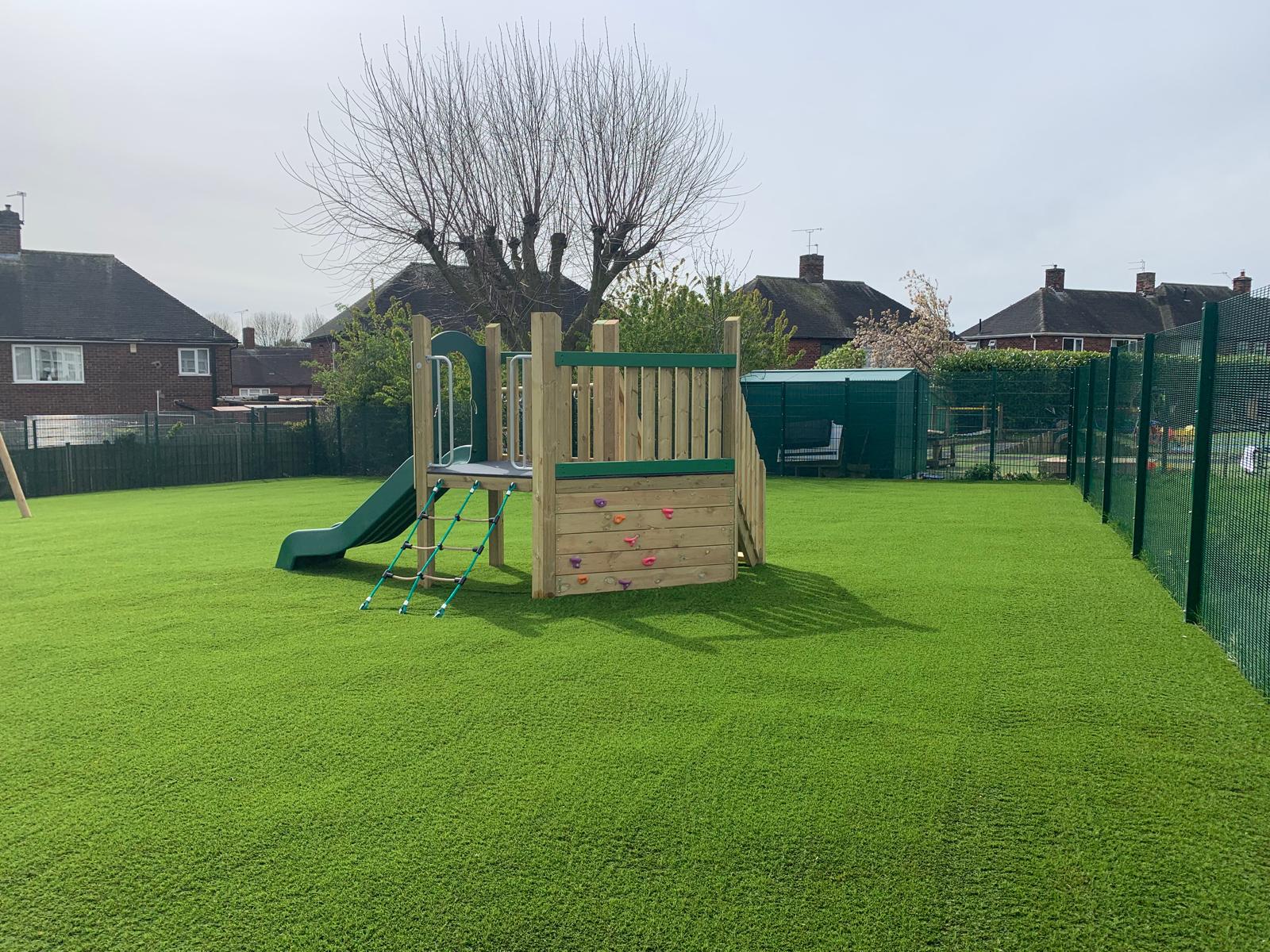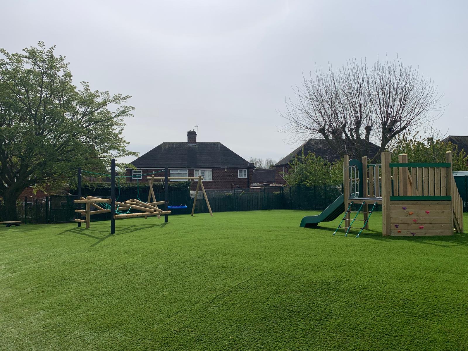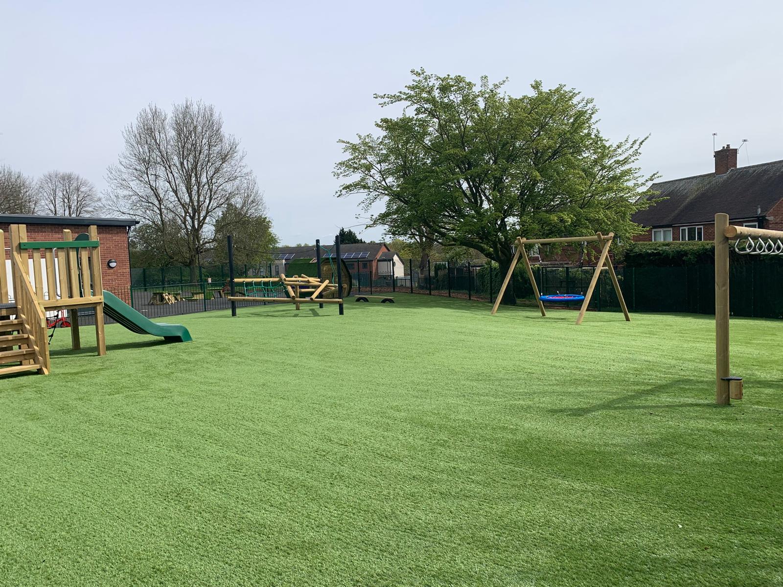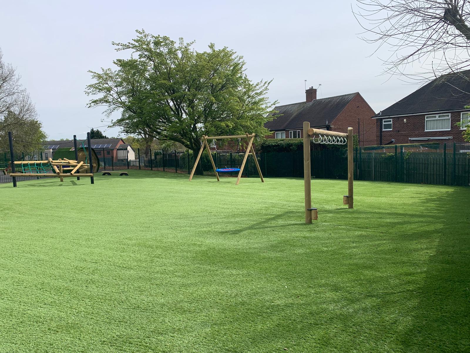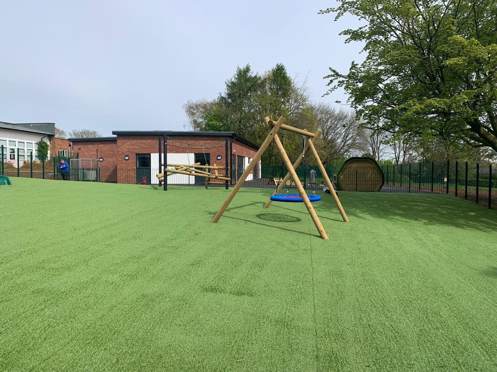 Outcome – The success of this project was all in the preparation. The 500m2 grassy area underwent complete excavation, including the removal of waste, and regrading with spoil from the site itself. A 100mm layer of MOT type stone was installed to enhance drainage and ensure level consolidation. These groundworks were topped with high grade 35mm pile artificial turf. The SEN play area, featuring swings, rotators, climbers, and spinners, meets the client’s specifications and compliments the space. The design of the SEN play zone is future-proof, allowing for adaptation to the evolving needs of the school.
