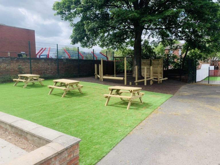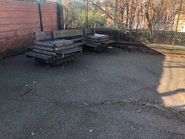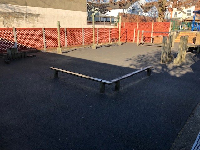 Due to the popularity of the trim trail, the school wanted an additional one. We therefore designed a second trim trail to go into the space that was not really used as a play area. A new trim trail, combined with a nice seated quiet area really brought this space to life. Rubber Mulch was installed under the trim trail as the area suffered with a few tree roots and this is the ideal surface to combat that problem. The quiet area had more artificial grass laid on top of the existing tarmac.