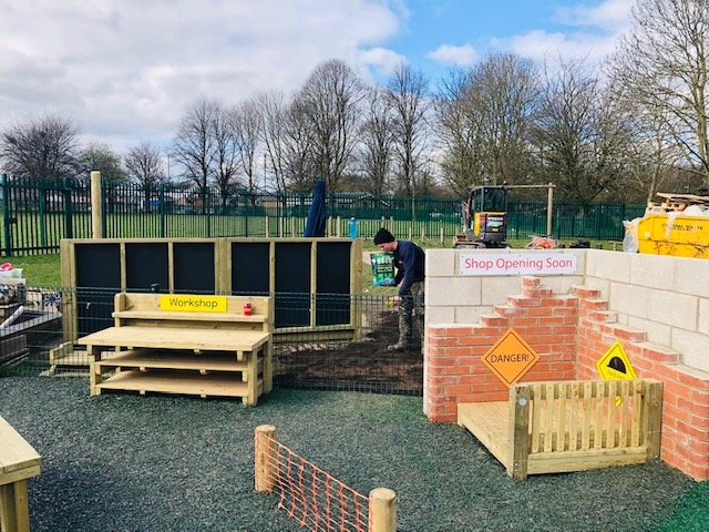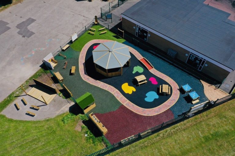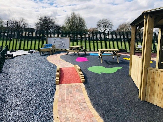 The finished play area looks stunning. The centrepiece of the area includes a block-paving roadway with textures integrated to provide sensory experiences. A large octagonal shelter in the middle of the roadway provides an area of shade from sun and an ideal location to carry out role-play activities. A range of brand new, all year round surfacing has been installed including Artificial Grass, Wetpour and Bonded Rubber Mulch. Other areas include a Construction Zone, Mud Kitchen, Play Hut and a large sand area.