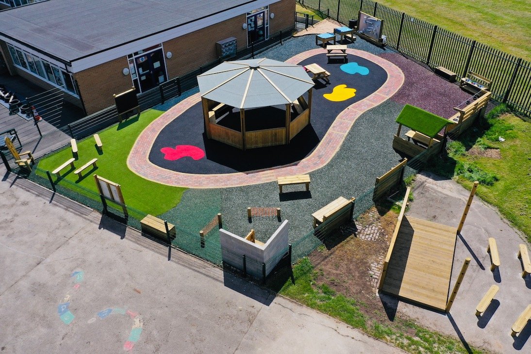 The finished play area looks stunning. The centrepiece of the area includes a block-paving roadway with textures integrated to provide sensory experiences. A large octagonal shelter in the middle of the roadway provides an area of shade from sun and an ideal location to carry out role-play activities. A range of brand new, all year round surfacing has been installed including Artificial Grass, Wetpour and Bonded Rubber Mulch. Other areas include a Construction Zone, Mud Kitchen, Play Hut and a large sand area.