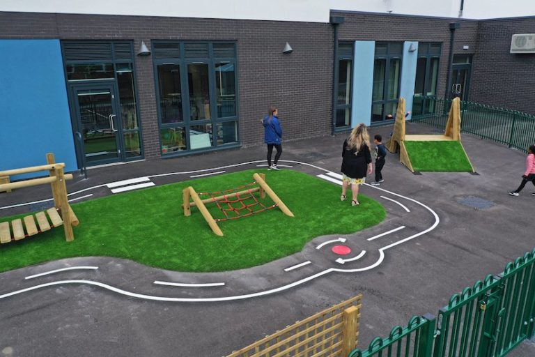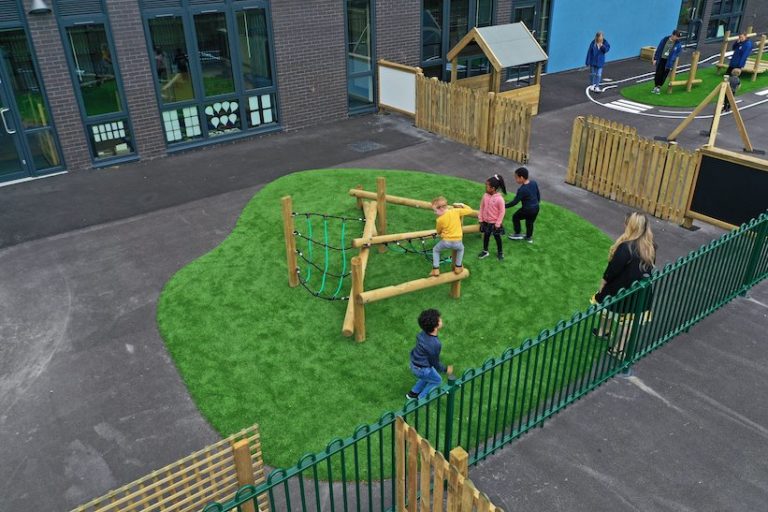 The nursery area featured a thermoplastic roadway on which the children could use tricycles, an early years’ wobbly bridge, balance beam and mini-challenge net, mountain and mines tunnel, wigwam, storytelling chair with mushroom seats, planters and trellises, magnetic water wall and an adjacent water tray. All-weather, artificial grass landscaping was installed within the roadway and around the challenge net to provide a more inviting setting.