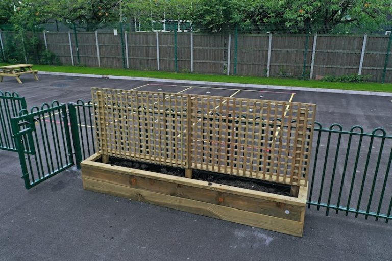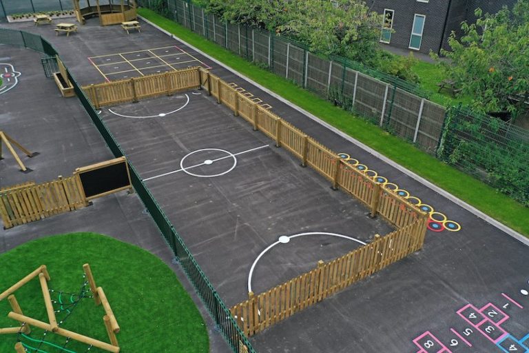 The Key Stage 2 play area was also designed to incorporate many of the school’s outdoor sports facilities. A key feature was a mini football pitch created using playground markings and sectioned off from the rest of the playground using picket fencing for increased safety. A multi-skills zone was also installed, comprising a number of target, stepper, jumping and exercise markings. A basketball net and panel, together with basketball markings, were placed at one end of the playground while, at the other, three picnic tables and a large octagonal shelter were installed. The shelter contains seating and can be used for outdoor lessons as well as for use during playtimes. The KS2 playground was also partially landscaped across its entire length using artificial grass, while shrubs have been planted behind the octagonal shelter to help shield it from the wind.