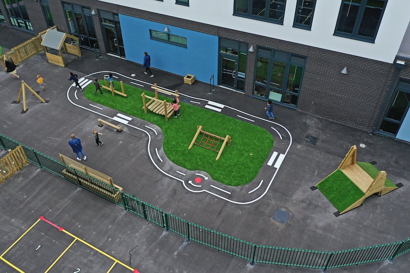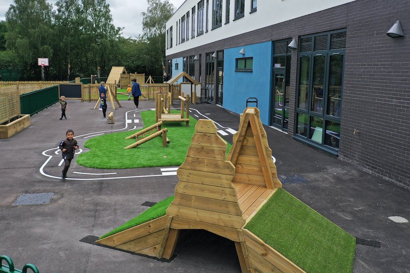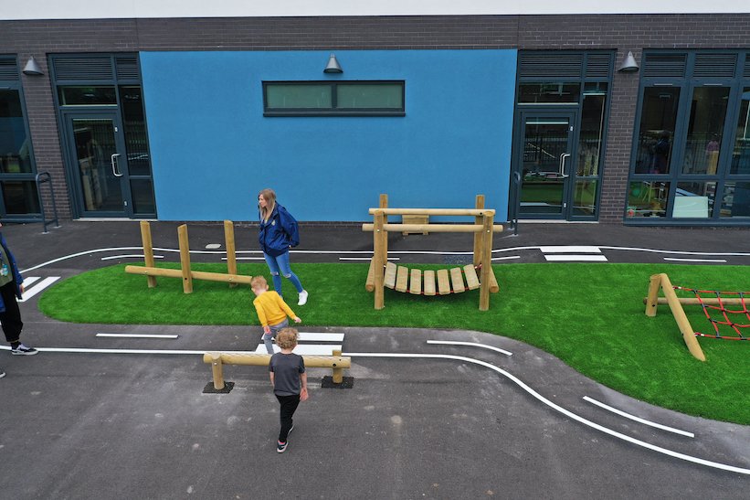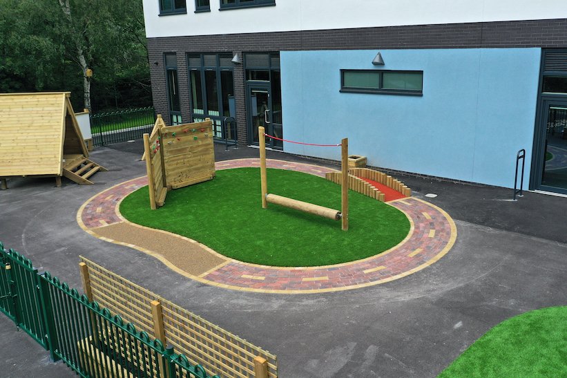 The nursery area featured a thermoplastic roadway on which the children could use tricycles, an early years’ wobbly bridge, balance beam and mini-challenge net, mountain and mines tunnel, wigwam, storytelling chair with mushroom seats, planters and trellises, magnetic water wall and an adjacent water tray. All-weather, artificial grass landscaping was installed within the roadway and around the challenge net to provide a more inviting setting.