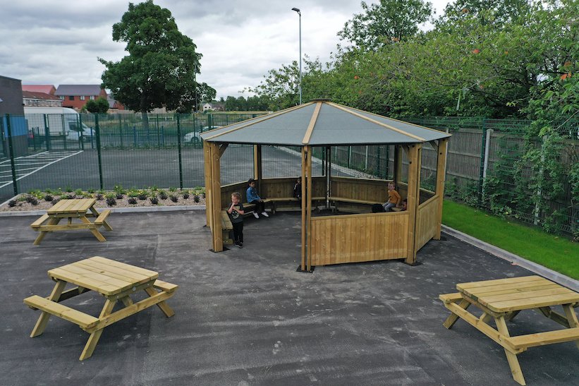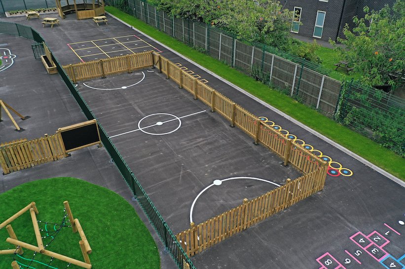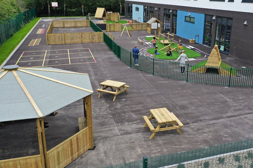 The Key Stage 2 play area was also designed to incorporate many of the school’s outdoor sports facilities. A key feature was a mini football pitch created using playground markings and sectioned off from the rest of the playground using picket fencing for increased safety. A multi-skills zone was also installed, comprising a number of target, stepper, jumping and exercise markings. A basketball net and panel, together with basketball markings, were placed at one end of the playground while, at the other, three picnic tables and a large octagonal shelter were installed. The shelter contains seating and can be used for outdoor lessons as well as for use during playtimes. The KS2 playground was also partially landscaped across its entire length using artificial grass, while shrubs have been planted behind the octagonal shelter to help shield it from the wind.