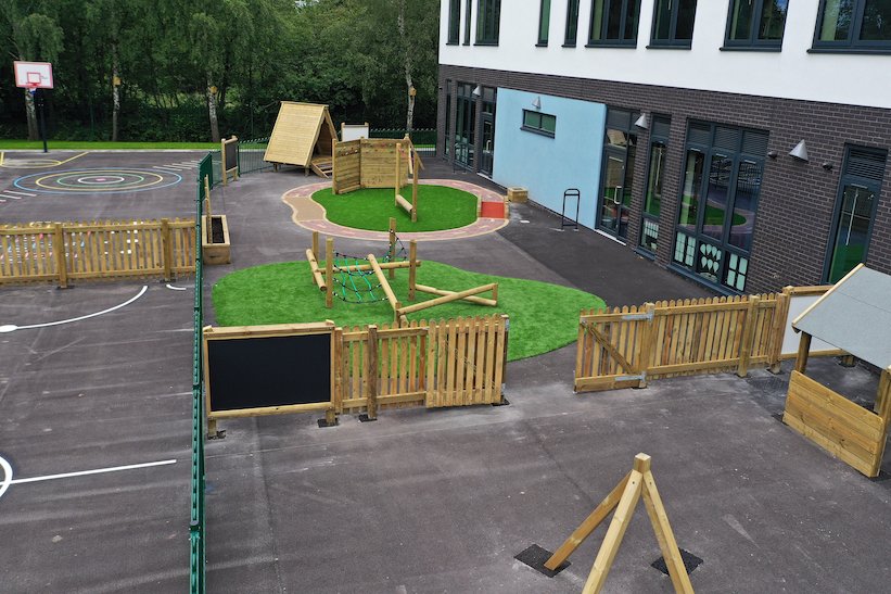 The Key Stage 1 play area was installed with slightly more challenging playground equipment, including early years’ jungle bars, spinning log, bespoke ‘Tangled’ rope and beam apparatus and a traversing wall. It also featured a block paving roadway with bridge, artificial grass landscaping, trellis and planters against a green fence, large play hut and a magnetic water wall with water tray.