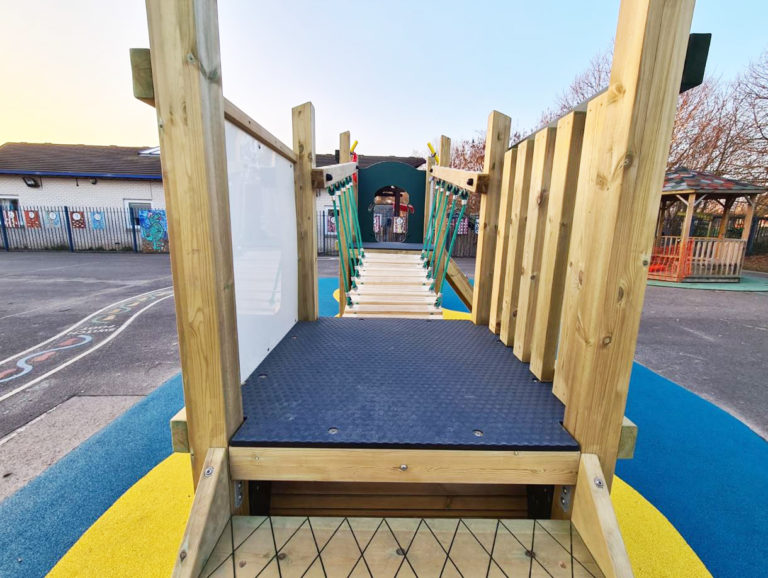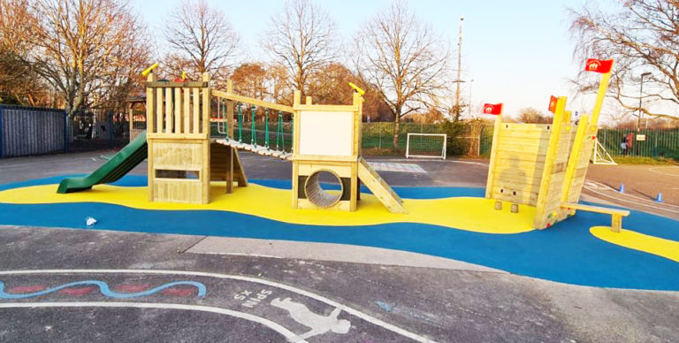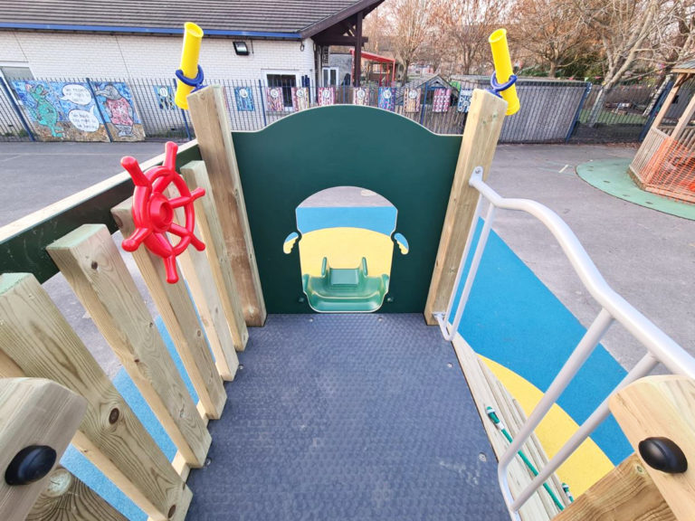 The school had an uninspiring seating style boat that was old and in need of replacing. The school wanted to replace with something similar. We designed and installed this visually impressive ship with a beach themed wetpour safety surface, that offers both physical and imaginative development opportunities for the KS1 children.