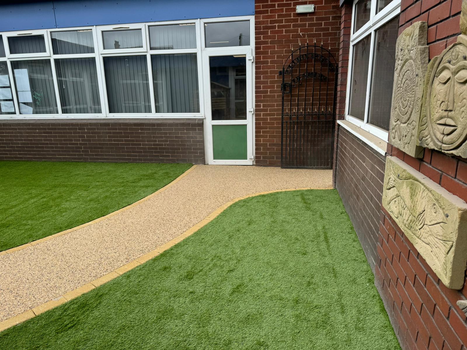 Initially, Robyn requested a pathway in wetpour, however, she was advised by the representative that wetpour can be slippery when wet or icy and that it is also one of the most expensive surfaces, therefore, she was presented with two further options to consider; resin bound gravel and block paving. She wanted the pathway to lead from one door to another door and an open corner. There was also a step under the first door that she also wanted to have surfaced as well, the remainder of the area was to be surfaced with artificial grass. There was also an existing concrete base that needed removing where an old pergola used to sit but all in all the project was very straight forward.