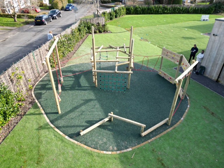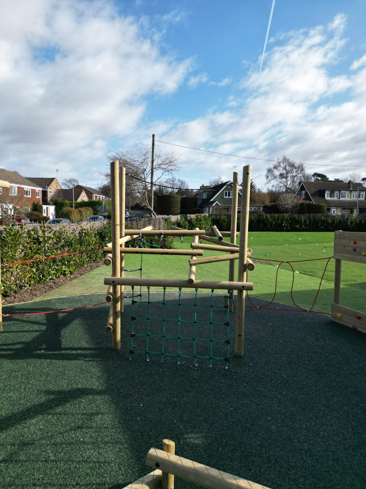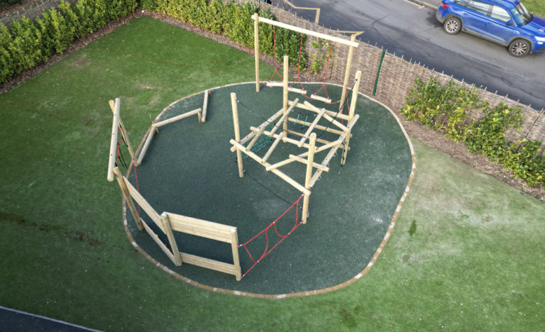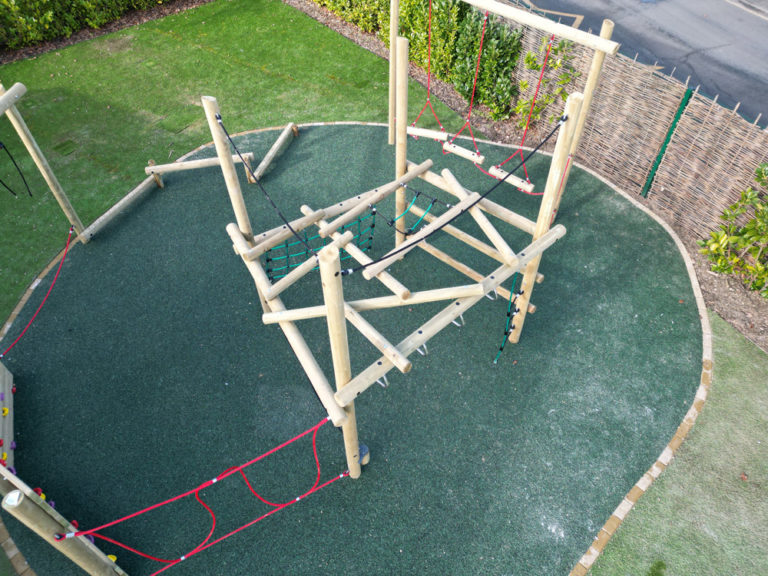 The school wanted to add physical activity equipment to an area that had artificial grass that was failing. The equipment need to be suitable for ages 7-11. We created a bespoke climbing unit to give the children more play value connecting one of our popular TangleWood units to trim trail items giving the school more for their money.