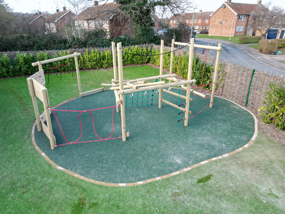 The school wanted to add physical activity equipment to an area that had artificial grass that was failing. The equipment need to be suitable for ages 7-11. We created a bespoke climbing unit to give the children more play value connecting one of our popular TangleWood units to trim trail items giving the school more for their money.