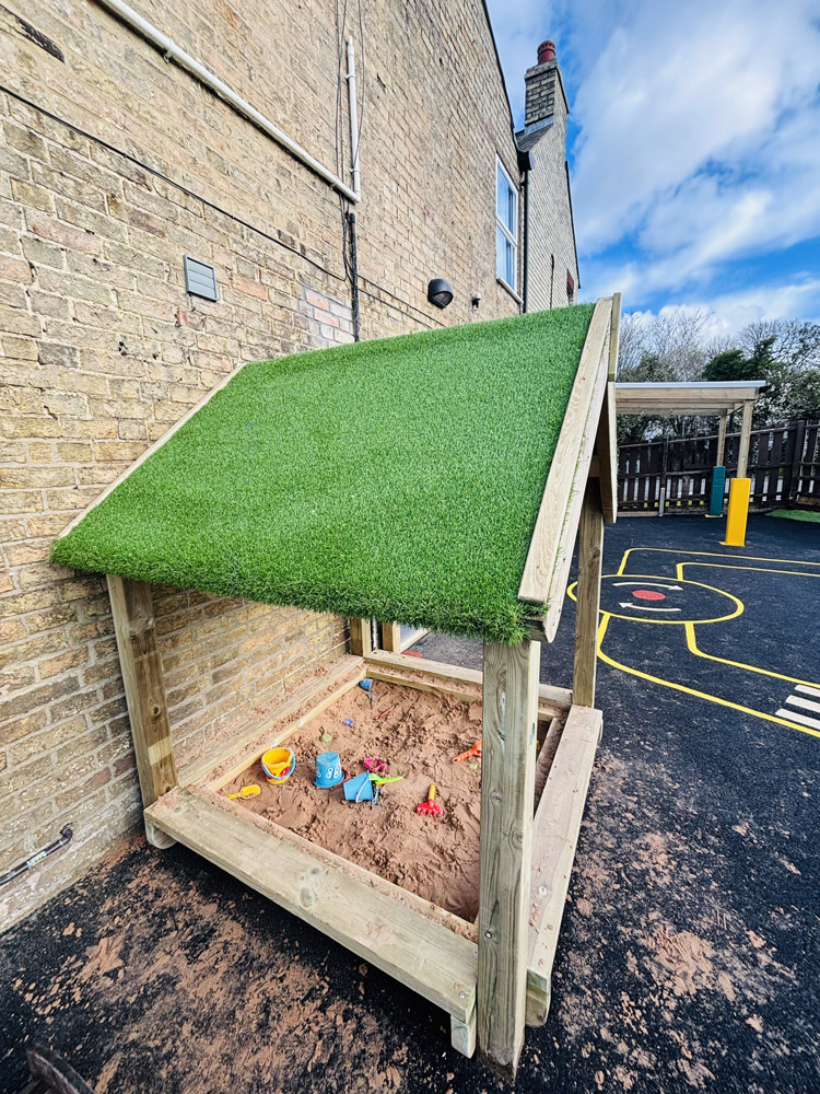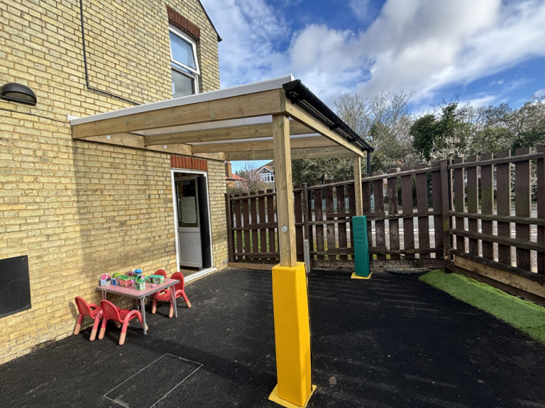 The new play area also required some shelter from the sunny weather and the rainy days and to hep provide the continuous outdoor provision. The team at ESP installed a made to measure lean to canopy which was manufactured to attach perfectly to the existing building.