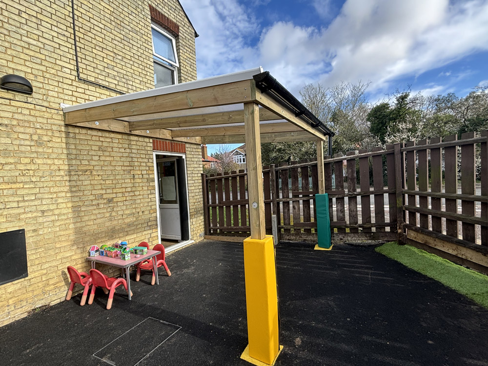 The new play area also required some shelter from the sunny weather and the rainy days and to hep provide the continuous outdoor provision. The team at ESP installed a made to measure lean to canopy which was manufactured to attach perfectly to the existing building.