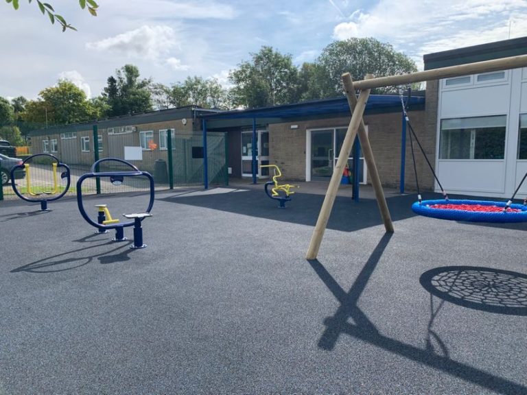 The school opted for wetpour surfacing as it was already installed in several other areas. They requested a 50/50 mix of blue and black, considering that some children walk barefoot during summer, and pure black surfaces become hot in direct sunlight.