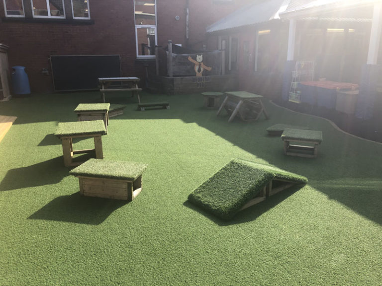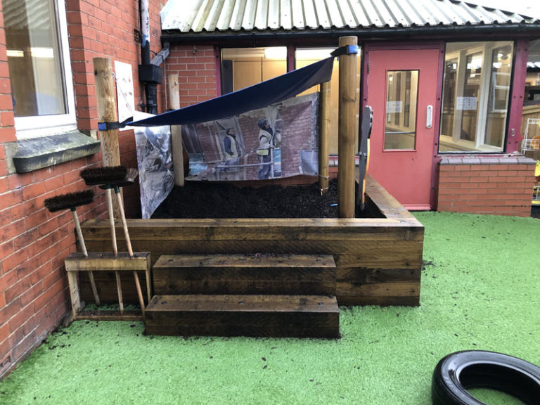 The project began with two meetings at the school; the first to discuss the initial vision for the area and the second to discuss the initial design proposal. ESP Play amended the initial design which was then approved by the school. The ESP Play installation team began work on the area by building the bespoke corner role play hut, they removed and replaced the existing bark pit, attached the large chalk board to the wall, cemented the magnetic water wall into the ground and built the new storage sheds, workbench and planter benches. The team continued by laying the artificial grass surface, sensory path and rubber mulch. They completed the project by adding the freestanding picnic tables, tray stands and open-ended climbing blocks.
