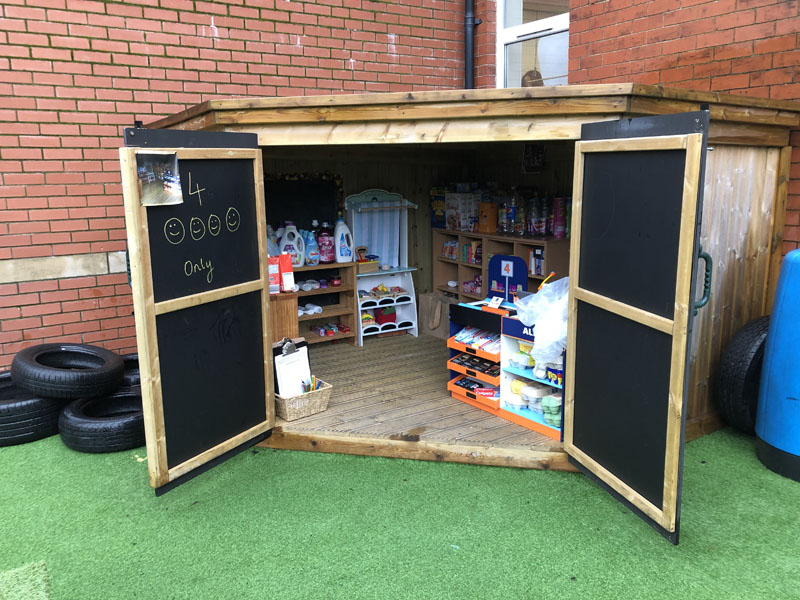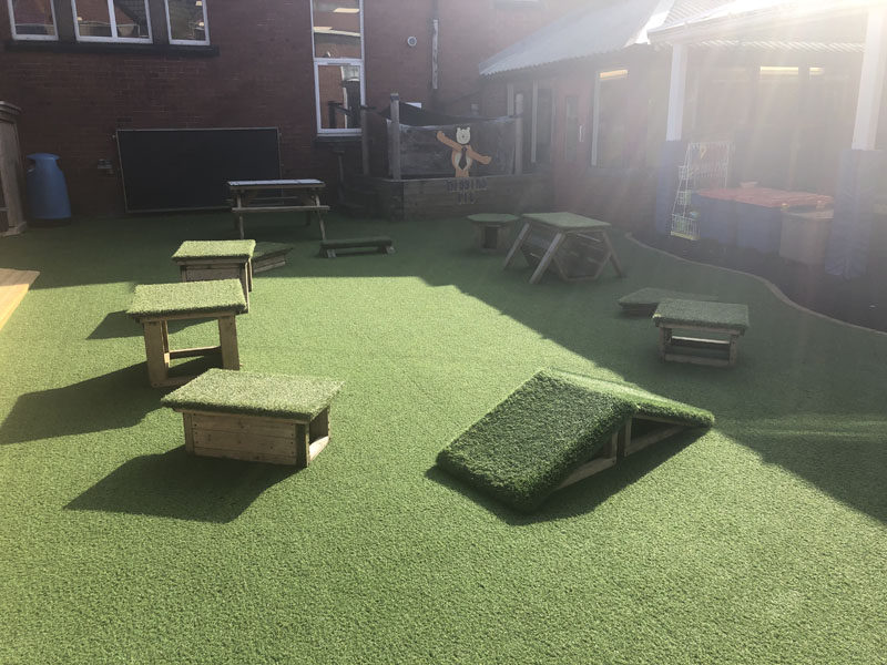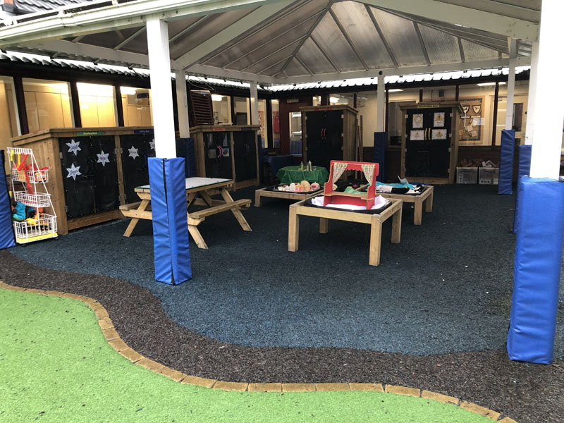 The project began with two meetings at the school; the first to discuss the initial vision for the area and the second to discuss the initial design proposal. ESP Play amended the initial design which was then approved by the school. The ESP Play installation team began work on the area by building the bespoke corner role play hut, they removed and replaced the existing bark pit, attached the large chalk board to the wall, cemented the magnetic water wall into the ground and built the new storage sheds, workbench and planter benches. The team continued by laying the artificial grass surface, sensory path and rubber mulch. They completed the project by adding the freestanding picnic tables, tray stands and open-ended climbing blocks.