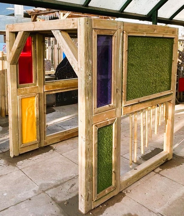 Donna and her team were delighted with the plan we submitted. We were able to include a spinner and springer with the required safety surfacing. A coloured roof canopy which reflects light through creating a rainbow effect underneath. A short sensory tunnel is situated under the existing canopy complete with colour and texture panels as well as musical chimes, mirrors and a dry wipe panel. The vent was boxed in with a bespoke sensory cover. A raised den has been included in the far corner to allow for quiet time.. Additional features such as a water wall, mirror boards and mark making boards have also been installed in the area. Finally, PVC screening with a calming forest theme has been attached to the fencing for privacy.