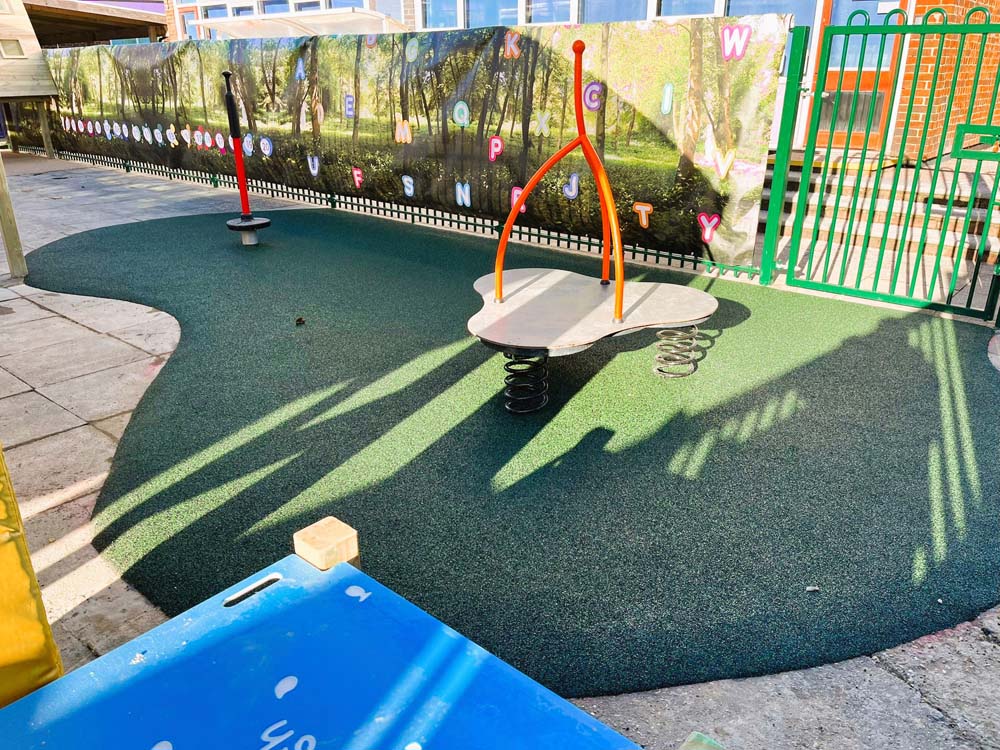 Donna and her team were delighted with the plan we submitted. We were able to include a spinner and springer with the required safety surfacing. A coloured roof canopy which reflects light through creating a rainbow effect underneath. A short sensory tunnel is situated under the existing canopy complete with colour and texture panels as well as musical chimes, mirrors and a dry wipe panel. The vent was boxed in with a bespoke sensory cover. A raised den has been included in the far corner to allow for quiet time.. Additional features such as a water wall, mirror boards and mark making boards have also been installed in the area. Finally, PVC screening with a calming forest theme has been attached to the fencing for privacy.
