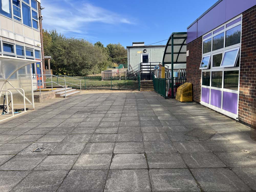 Donna the site manager contacted 3 companies as is best practice for schools. The existing space was a blank paved area. They wanted to create an area specifically for the children with autism. The requirements were: sensory elements, colour, canopy, some spinning equipment and a hide away space. Additionally, an existing vent protruded from the wall which they wanted to try to cover or hide.