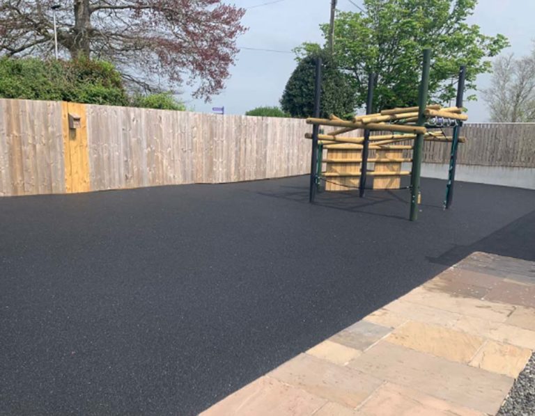 The rubber crumb has been excavated (repurposed around the school grounds) and 40mm black wetpour has been installed to a 100mm MOT stone base.