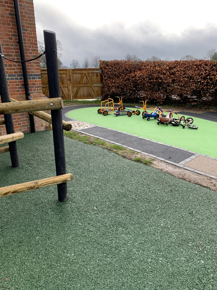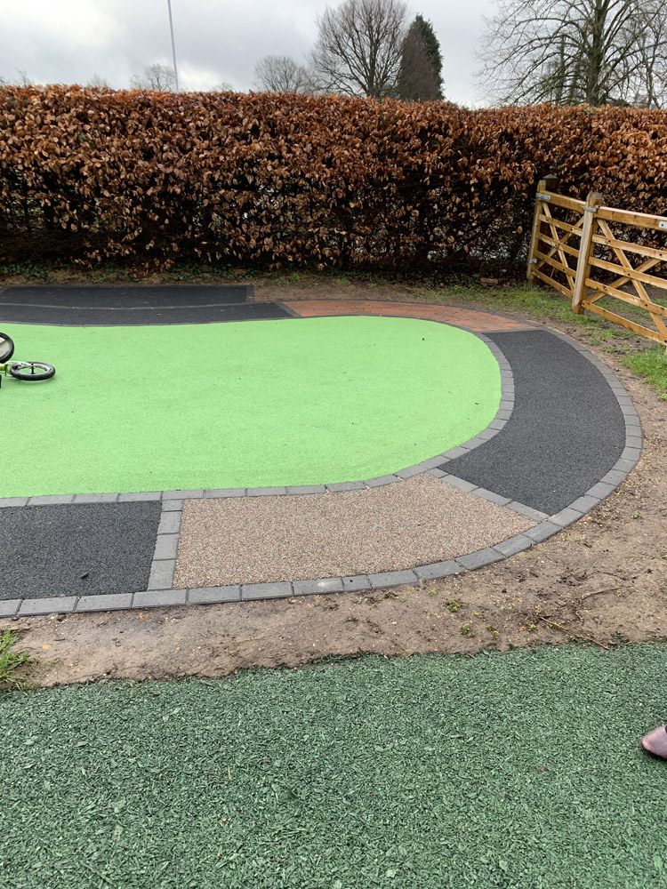The trim trail we installed had a range of challenge that were still suitable for the younger children and an artificial grass safety surface was included to keep the natural feel the school wanted. We included a bespoke octagonal shelter with seating that was open sided to provide visibility. In the EYFS area we installed a sensory roadway with one of our TangleWood units with a mix of rubber mulch and wetpour to keep withing budget.